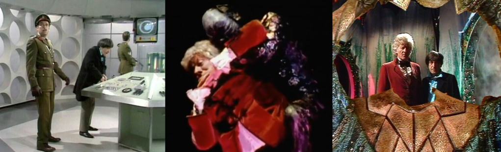 Pushed to the edge of his sanity, Omega resolves to destroy everything in a fit of rage, driving the Doctors and their companions back into the TARDIS, where the First Doctor leads another telepathic conference that directs them towards the TARDIS’s forcefield generator, which they hope to use to bargain for their freedom, and with it the very key to defeating Omega. All throughout the serial, the Second Doctor has been banging on about his recorder, having lost it early into the story; it turns out that it fell into the forcefield generator, and as a result was not converted from matter to antimatter. Initially, the Doctors planned to offer to use the forcefield generator to free Omega, but by this point the insane Time Lord has become content to live out his exile alongside his fellow Time Lords and thus spare their universe and friends from his reprisals. Infuriated at the Doctors’ attempts to placate him with “trinkets”, Omega casts the forcefield generator aside, thereby destroying himself and his antimatter universe when the unconverted recorder falls to the floor. The two Doctors are returned to Earth triumphant, though the Third Doctor laments that he/they couldn’t offer Omega any freedom other than death and the Second Doctor bemoans the loss of his recorder. After bidding farewell to the First Doctor, and an amicable parting between the Third and Second Doctors, Third Doctor is elated to find that the Time Lords have restored his knowledge of how to travel through time and space, and provided the TARDIS with a new dematerialisation circuit, thus ending his exile on Earth and restoring his freedom at long last.