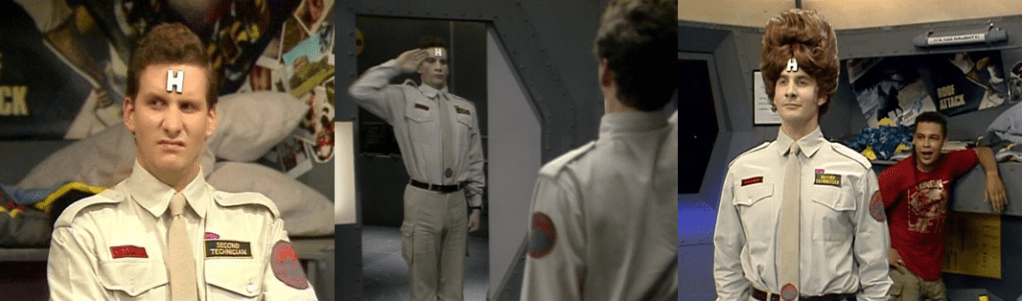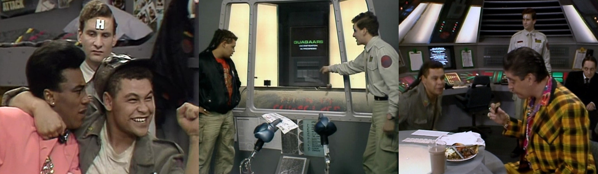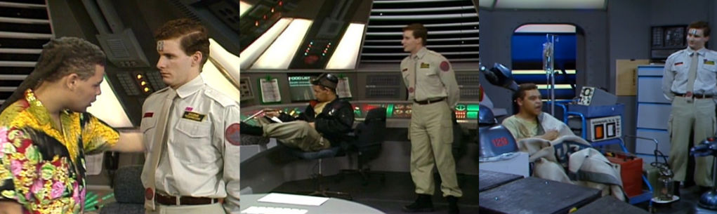 Perhaps more so than any other series of Red Dwarf, series one hinges on the chaotic relationship between Lister and Rimmer. The two cannot stand each other and are constantly finding ways to either put the other down or wind each other up and, while every episode explores their relationship in some way, “Balance of Power” (Bye, 1988) goes all-in with showing just how frustrated Lister is by Rimmer’s oppressive and borderline insane hang-ups. Rimmer despairs of Lister’s hygiene, his taste in music, his lack of ambition, and his slobby nature but is also paranoid about losing his fragile existence in favour of Kochanski. To that end, Rimmer arranges to hide the hologram discs from Lister and refuses to entertain even a short switch off, so Lister resolves to force him to listen to him by passing his chef’s exam. This shakes Rimmer, not just because he believes a chef is a “white-hatted ponce” rather than a real officer, but also because of the very real fear that Lister could actually succeed, especially given that Lister showcases flashes of intelligence and capability throughout the show and he actually tries to revise rather than making excuses like Rimmer. When his attempts at reasoning with Lister fail, he assumes Kochanski’s form and tries to talk Lister out of his efforts; however, while initially crushed by her rejection, Lister quickly sees through Rimmer’s charade, exposing him with ease. Their issues finally come to a head in the final two episodes; interestingly, Rimmer shows genuine concern when Lister’s pneumonia causes physical manifestations of Lister’s Confidence (Craig Ferguson) and Paranoia (Lee Cornes) to appear. In a flash of uncharacteristic concern, and despite how similar Paranoia is to him, Rimmer sees them as dangerous and symptomatic of Lister’s illness since, as long as they exist, Lister can’t recover. Rimmer even tries to distract Paranoia so a Skutter can sneak up on him to sedate him but is unsuccessful, but his concerns are largely out of his selfish desire not to be left alone with just Holly and the Cat for company. In the end, he’s proven to be right, and then gets the last laugh by swapping Kochanski’s disc with his own, creating two Rimmers. At first, both Rimmers and Lister are happy to be rid of each other; Lister delights in being free from Rimmer’s rules and irritations and the Rimmers deck their quarters out with everything they need to motivate (procrastinate) and succeed (self-aggrandise), much to Lister’s amusement.