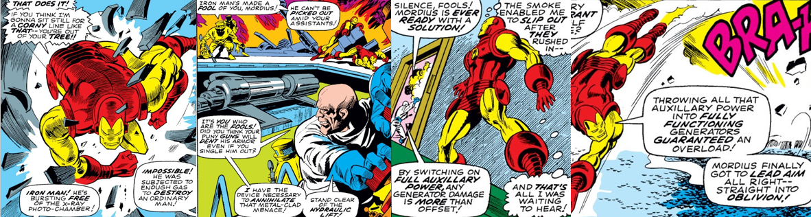 However, Iron Man proves to not be as subdued as Mordius believed thanks to the oxygen supply contained in his armour; he breaks out of the chamber, destroying the irreplaceable “Vario-Mold Matrix” that allowed Mordius to copy his armour, but Mordius’s copies wildly malfunction when they try to use the Repulsor Ray technology and jet boots, causing only further damage to the A.I.M. master’s laboratory. Incensed at the development and convinced that Iron Man somehow sabotaged the process, Mordius both opens fire and commands his minions to stop messing around with the armour’s ordinance and attack Iron Man directly. Thankfully for the Armoured Avenger, the numbers advantage of his enemies means little; his armour’s “refractory casing” distorted the x-ray enough to produce inferior replicas and the fake Iron Men are nowhere near as skilled in utilising the armour’s full potential, easily allowing him to outfight them. Now determined to obliterate his hated enemy, Mordius fires a massive rocket cannon at the armoured group, no longer caring a lick for the fates of his loyal followers. However, Iron Man is able to avoid this lethal blast and sabotages the generator room; in response, Mordius unwittingly seals his fate and the fate of his fellow A.I.M. soldiers as he causes a massive power overload when he cranks up the auxiliary power. Thus, Iron Man is able to fly to safety while seemingly the entire castle explodes behind him, presumably taking all inside it in its wake and leaving shellhead to ponder that Mordius’s inability to consider himself anything less than perfect ultimately lead to his demise.