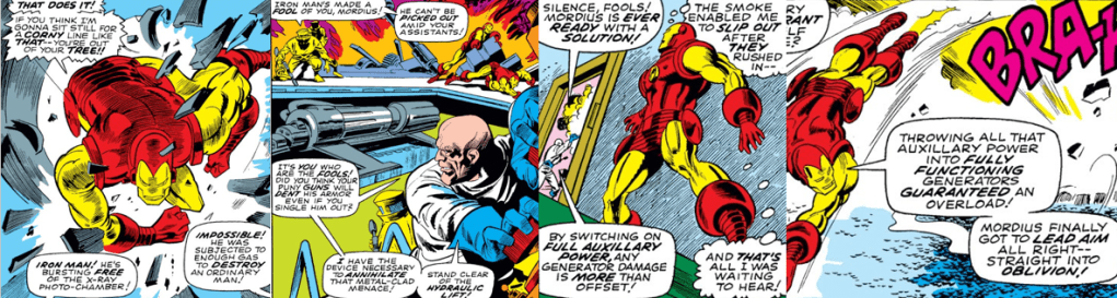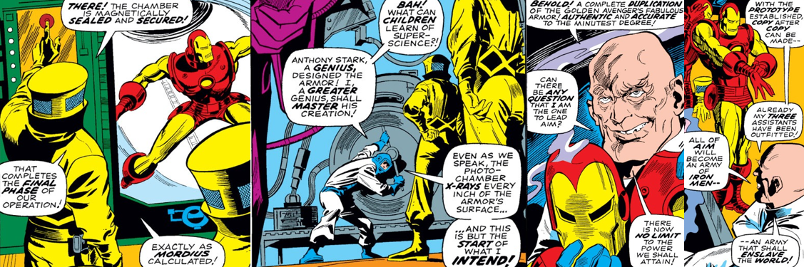 This is merely a side-plot to the main story, however, which sees the bee-suit-wearing A.I.M. grunts entrap Iron Man in a magnetically sealed chamber on the orders of Mordius. Iron Mans fight with Mark Scarlotti/Whiplash in the previous story has drained his Repulsor Rays and the chamber is too tough for him to expend the energy trying to batter through, but he doesn’t have too long to worry about any kind of escape plan as A.I.M. promptly render him unconscious with a knockout gas and transport his helpless form to Mordius’s castle out on a small island off the New England coast. The A.I.M. minions are absolutely devoted to their master’s cause and the sanctity of A.I.M.s…well, aims, but Mordius himself is quite the abusive blowhard: garbed in a blue helmet and white outfit, he doesn’t tolerate tardiness, claims A.I.M.’s greater glory is his for the taking, and makes aggressive demands of his underlings without gratitude or concern for their welfare, but they’re only to happy to bow to his every whim and place the unconscious Avenger in the “X-Ray Photo-Chamber”. Mordius’s goal is less about the main within the armour and more with uncovering the secrets of the technology that powers Iron Man’s superhuman feats and is so confident in his machine that he removes his protective headgear, thus shedding the usual anonymity afforded to A.I.M.’s representatives, which also serves the dual purpose of clearly setting him above and beyond the usual A.I.M. grunts. Mordius delivers a lengthy soliloquy on the advanced capabilities of his machine, which scans and analyses every inch of the Iron Man armour and produces near-perfect replicas that he wastes no time in outfitting to three of his underlings.