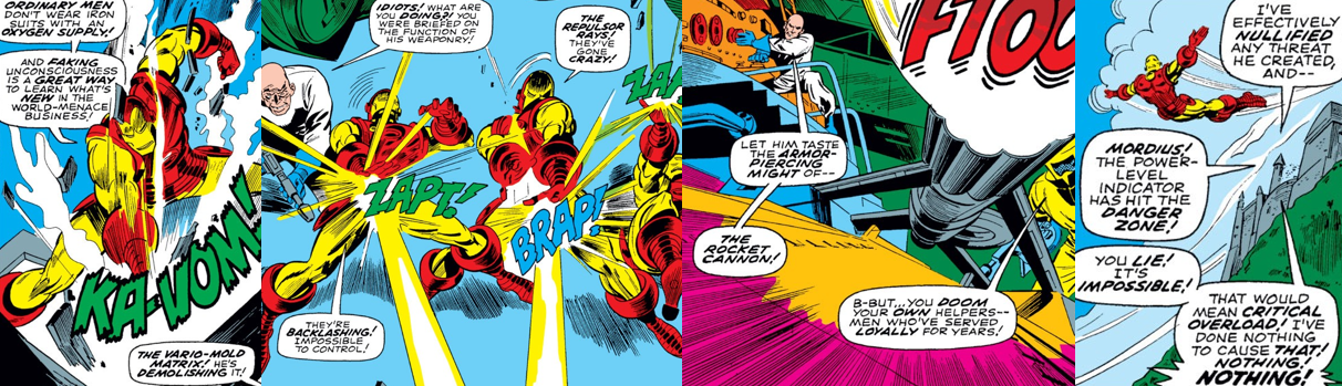 Well…this was certainly a whole lot of nothing. Just about the only thing “Alone Against A.I.M.!” has going for it is Gene Colon’s stunning artwork and Johnny Craig’s vibrant colouring, which really bring Iron Man to life. I think beginning Iron Man’s first solo series with the conclusion to a previous story was a pretty poor decision; it seems to me like starting a two-story arc and ending the first issue on a cliffhanger would have been far more effective but, instead, we get this forgettable tale where Iron Man feigns being unconscious for the majority of the narrative and we’re left wasting time with the weirdly articulate Sitwell and Mordius, two characters who simply love finding the most dramatic and overblown way to fill up panels with pointless dialogue. Since he’s a far greater part of the story, Mordius obviously carries a lot of the blame for this; he monologues at length about his amazing machine, gloats nonstop about his assumed victory, and seems to be this hyper-intelligent, super-smart tyrant but descends into an enraged madman to moment his plans go awry.