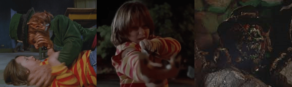In the vast pantheon of horror movies and icons, it’s easy to dismiss or forget the leprechaun; like many horror villains, he quickly descended into parody and cartoonish violence and a string of low-budget, low-effort sequels saw this ridiculous concept run out of steam far faster than other more complex or alluring horror monsters. The core idea is ridiculous by its very nature and the film definitely doesn’t shy away from that, which I think is a positive, but I can’t say that I’ve ever been much of a fan of the film, the character, or this franchise as a whole. Granted, I’ve only seen about four of the eight films in the series, but none of them were as memorable or terrifying as the squat creature’s more influential peers. However, the 17th of March is St. Patrick’s Day and, since I make a habit of celebrating other holidays like Halloween and Christmas, it only seems fair to mark the occasion with a review of the first film in this often overlooked horror-comedy franchise. Unlike in the vast majority of horror films, the first character we even see onscreen is the villain of the piece, the titular leprechaun. Normally, there’s at least some kind of build up to the reveal of the killer or monster of a horror film but the monstrous little troll comes shambling onto the screen within the first minute of the movie. A squat, curious little fellow, the leprechaun is almost disarming in how absurd he seems; dressed in a bright green suit topped off with a fancy little hat, he seems like a figure of ridicule and his predisposition for talking in rhymes certainly ties into his ridiculousness. However, closer inspection reveals that he’s quite the disturbing little creature; with his deformed face, fangs, and claw-like hands, he’s more of a stout gremlin than a fanciful figure of folklore and he immediately asserts not only his avarice for his beloved pot of gold but his willingness to murder anyone who dares steal from him.