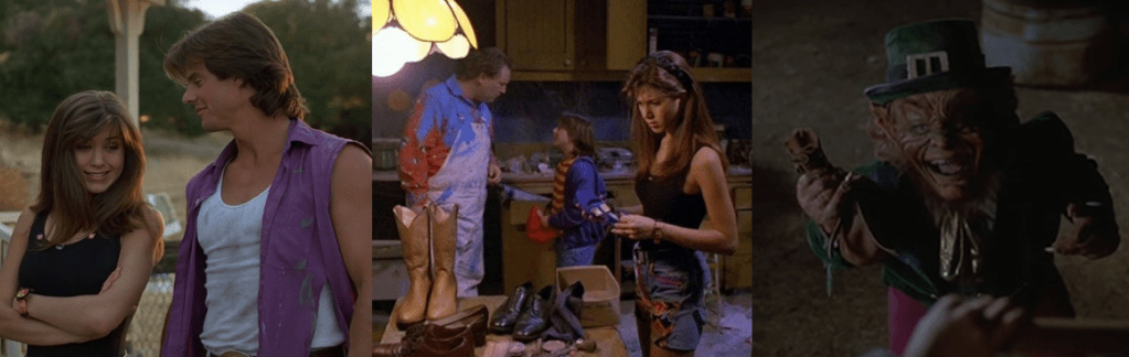 The bombastic and painfully stereotypically Irish Dan O’Grady believes his financial woes have been solved when, while visiting Ireland to take care of his mother’s funeral, he comes across the leprechaun and manages to not only capture the creature but get his hands on his gold. He promptly brings the cursed coins back to the United States, much to the chagrin and annoyance of his wife, Leah (Pamela Mant), who learns the hard way that O’Grady’s tall tales of a gold-hoarding leprechaun are all too true when the vicious little sprite stows away in O’Grady’s luggage, lures her in by mimicking a child’s voice, and scares her into taking a fatal fall down the cellar stairs. Although O’Grady’s able to get the better of the leprechaun and trap him in a crate thanks to a four-leaf clover, he suffers a near-fatal stroke before he can set the creature on fire, meaning the leprechaun’s curse carries over to the next people to come onto O’Grady’s property. This ends up being J. D. Redding (John Sanderford) and his bratty teenage daughter Tory (Aniston), who rent the O’Grady house for the summer, much to Tory’s displeasure; she’s far from happy at being out of Los Angeles and in the middle of nowhere, and even more unimpressed with the state of the farmhouse, which has been left to go to ruin over the last ten years. While J. D. is excited to be away from the hustle and bustle of city life, Tory bemoans the lack of shopping malls and just wants to get back to civilisation, and to a hotel, and away from the dilapidated house. Tory’s solution to any problem is to throw money at it; as such, she doesn’t even think to apologise when she accidentally bumps into Nathan Murphy (Olandt) and spills his paint thinner, instead offering cold hard cash for the inconvenience. A vegetarian and a pacifist, Tory sees herself as an independent and forceful woman of the nineties, but she easily takes Nathan’s bait when he insinuates that she’s afraid of the house like some flustered female and decides to stay after all and even ends up helping him out with the chores because of an obvious attraction to the young painter.