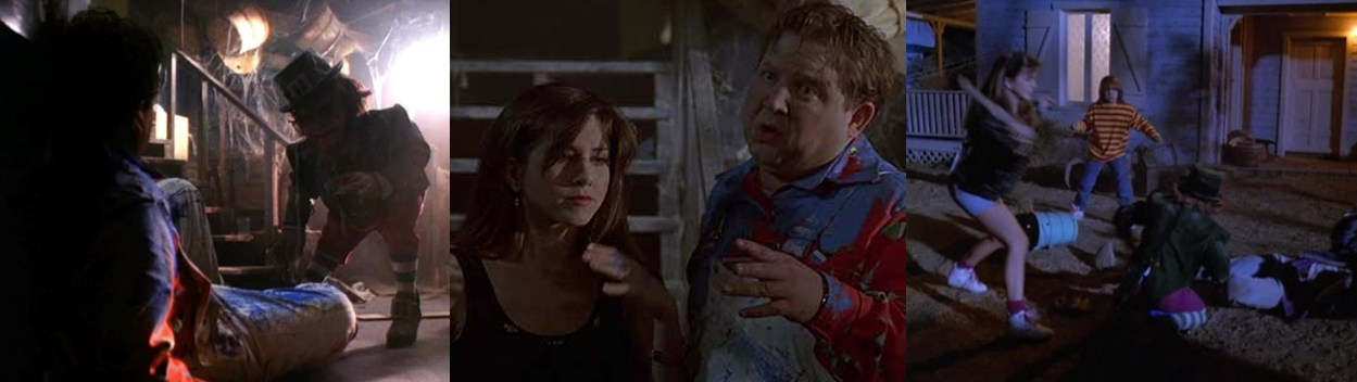 While the leprechaun’s outfit is a bit much (it’s like something out of a pantomime or a costume shop and could’ve done with looking a bit more worn and faded in some places), Warwick Davis is completely unrecognisable beneath the creature’s malformed visage; sporting a permanent leering smile and a mouthful of rotten fangs, the leprechaun is a disgusting little troll who showcases an array of magical powers. Initially weakened from ten years of the four-leaf clover’s influence and barely able to cause a door to shut with his magic, the leprechaun rekindles his strength naturally over time but the film also implies that terrorising and killing others restores his power as much as being in possession of his magical gold. To that end, he delivers some of the most bizarre kills in horror cinema; because of his short stature, it’s easy to dismiss the leprechaun’s threat but he sports razor sharp nails, has a tendency to bite chunks out of people, and exhibits a strength beyond his size that borders on the superhuman. As mentioned, he crushes a man to death with a pogo stick; he claws at Deputy Tripet’s (David Permenter) face and then uses his teleportation powers to toy with him before snapping his neck with his bare hands; he also threatens to cut Nathan’s foot off with a rusty hatchet after injuring him with a bear trap and even exhibis control over his severed hand after it’s cut off by a door. The leprechaun’s only real weaknesses is his obsessive compulsion to stop and shine shoes when he spots them and the magical powers of a four-leaf clover, which is enough to keep him trapped in a crate for ten years and ultimately cause him to melt into a skeleton (and even then he just keeps coming). While some horror monsters and slasher villains have reasonably vague motivations, the leprechaun is fixated on finding his crock of gold; while he delights in tormenting and killing others, that’s really more for fun and in pursuit of his goal and there’s definitely a suggestion that he’d be placated if his gold were simply returned to him.