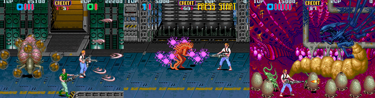 Aliens is the very definition of a coin-muncher; enemies will run at you and explode, taking a chunk off your health bar, and you get a couple of lives per credit. If you run out of credits, you can simply input some more and continue from where you left off, which is great news when you’re emulating the game as you can just plough ahead until you reach the ending. Its not all mindless sidescrolling shooting, however; the game always switches to a vertical shooter for some bosses and there’s a couple of bonus stages where you need to mow down Xenomorphs from the M577 Armoured Personnel Carrier (APC) in a desperate attempt to rack up points and rescue Rebecca “Newt” Jorden. Other tried-and-tested sidescrolling mechanics are here to help mix things up as well, including acid hazards dropping from above, sudden drops to sewers, explosive barrels, and, of course, a moving elevator stage where you need to fend off waves of enemies while travelling further down into the bowels of LV-426.