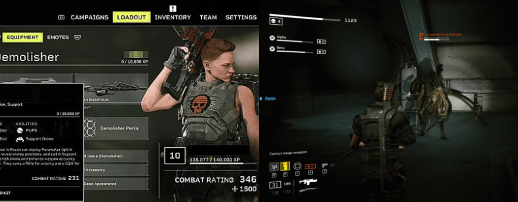 Aliens: Fireteam Elite is a third-person, squad-based shooter in which you can customise and equip an avatar from one of seven character classes (Gunner (my choice), Demolisher, Technician, Doc, Phalanx, Lancer, and Recon) and then take on four story-based campaigns alongside two other online players or two A.I.-controlled ‘bots if you don’t feel like playing online. Sadly, and strangely, couch co-op is not an option and you cannot pause the game if you need to take a piss or stop for a second; compounding matters is the fact that, if you stand idle for too long, enemies seem to spawn in to push you onwards, all of which can make for some tense gameplay that borders on frustration. If you’ve ever played a third-person shooter before than the game’s default controls won’t be anything new to you: you fire your current weapon with the Right Trigger, aim down your sights with the Left Trigger, reload and interact with consoles and such with X, snap to cover with A, perform a dodge roll with B, press in the right stick for a melee attack, swap to you side arm or secondary weapon with Y. You can also use the directional pad to heal yourself if you have a first aid kit on hand, access your consumables menu, and communicate with or revive downed teammates. Each weapon and character class comes with a “Kit” and “Role” ability, which you can activate with the Left or Right Bumper, respectively; as you play and unlock “Perks” and other modifiers, you’ll be able to temporarily improve your damage output, accuracy, increase your rate of fire, swap weapons out for more powerful variants (like incendiary shots), drop turrets, unleash a missile barrage, and so forth.