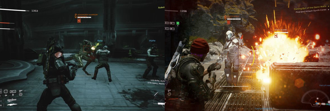 After worrying about letting down my clearly superior human partners, I switched to private matchmaking and played with a couple of ‘bots. Unfortunately, you can’t seem to change their character classes; they simply mirror your current loadout, which is a bit annoying as it probably would’ve been helpful to have a Demolisher and Doc on hand). After tearing my hair out trying to overcome the endless gaggle of Aliens and drones set on keeping me from taking off, I lowered the difficulty to “Casual” and managed to clear the first campaign, ending up on LV-895 and hissing with frustration at the inclusion of more tactically capable android enemies. Thankfully, you can fight through the Engineer ruins and make it to a bridge where, after a short countdown, you’ll get some much-needed air support. This won’t help you as you press deeper into the temple, though, where the “Working Joes” come to “life” and attack en masse, flamethrower-wielding Synth Incinerators dog you at every turn, and you’re forced to not just download data from androids but also to recover a number of Synth Cores from destroyed androids. Annoyingly, you can only carry one of these at a time, forcing you to run back and forth in a near constant firefight, and this is about where my patience with the game ran out. Presumably, you stand a better chance at success if you take the time to grind up your levels, acquire/buy and equip better Perks, gear, and weapons, and play alongside human players who can offer more immediate assistance but the game seems to be tailormade for repetition. A lack of in-mission checkpoints means you only every get one shot to clear each mission, making it incredibly frustrating when you fail to crawl your way to a teammate for revival, and the sheer number of janky, overly aggressive enemies can make what is occasionally a fun-filled, if near mindless, shooter an unfair chore to sit through.