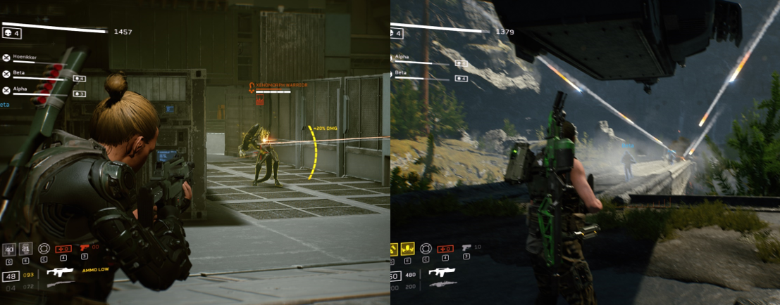 To begin with, I started on the “Standard” difficulty and played online as it seemed as though there was no other option available to me. after struggling a bit with the controls and navigating the many dark, dishevelled corridors and areas, all of which look the same so it’s easy to get turned around, I managed to limp my way through the first couple of missions and even pull my weight in fending off Xenomorph attacks thanks to clever deployment of turrets and making use to the ammo refill stations. Scattered around the environment, you’ll also find other temporary power-ups that turn your shots into incendiary or electroshock rounds, all of which is great to thinning out the alien hordes, and you’ll occasionally find special hidden crates containing new weapons and gear. Eventually, though, the difficulty really starts to ramp up; larger and far more aggressive Xenomorphs soon become the norm, with jumping red variants and massive drones charging across the environment and sporting hefty life bar. In these situations, you’re often trapped in a room or forced to activate a take-off sequence using various consoles while swarms of aliens spew in from all over and it can be pretty difficult fending them all off, especially when the game sometimes decides not to open doors for you to progress once all enemies are clear, thus forcing you to abandon the mission.