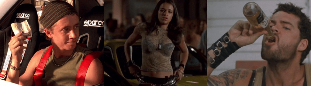 While themes of family eventually became so synonymous with the Fast and Furious franchise that it’s something of a running gag these days, it’s a reasonably subtle theme here; Dom’s crew is like his family and he acts as their undisputed patriarch, protecting, advising, and even scolding them when necessary. He issues orders with a gravelly tone and his word is the law since he’s the biggest and the best of them all; it’s very much a hybrid of a traditional, catholic Italian family unit and almost a mob situation as they look to him for guidance and direction and must follow his lead whether they agree with it or not. Of course, family is more explicitly represented in Dom’s protective relationship with his little sister, Mia; while showing off the pimped out 1970 Dodge Charger R/T he built with his father, Dom tell Brian how his father crashed and burned to death before his eyes, showcasing a vulnerability from the obvious trauma of this incident, which left him openly afraid to drive the Dodge Charger and driven into a mindless rage to punish the man responsible. Trust and loyalty are very important to Dom and key elements of the film; this, of course, makes things extremely difficult when it’s revealed that Brian is an undercover cop, something Vince takes great pleasure in learning since he had his suspicions about Brian from the start. However, while he realises that he’s jeopardised his relationships with Dom and Mia by deceiving them, Brian becomes so attached to the two that he’s forced to re-evaluate his position and set aside his orders to help Dom chase down Tran and Lance in the finale. One thing I do love about The Fast and the Furious is how utterly 2001 it is; this is reflected not just in the nausea-inducing shaky cam and perpetually sweaty, outrageously attractive cast and their loose-fitting clothes, but also the heavy rap-centric soundtrack (including one of my favourites, “Rollin’ (Urban Assault Vehicle” by Limp Bizkit). This hip-hop influence is reflected in the portrayal of many of the supporting characters, with rapper Ja Rule featuring in a small cameo, and in the thumping beats of the score; The Fast and the Furious even had the best of both worlds by releasing a second, more nu-metal-themed soundtrack that’s much more my jam.