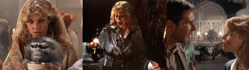 Willie is a natural performer; she’s at home on the stage, in a glittery dress, with all eyes on her and with her every whim catered for. Pampered, spoiled, and basking in the adulation of superstardom, she’s more than a performer; she’s a diva, one who abhors violence and squalor and expects to get everything she asks for even if the conditions don’t allow for it. Curious and bombastic, she forces herself into Indy’s life by interrupting his meeting with Lao Che and ends up being held hostage and treated as an expendable commodity by the conniving crime boss. Positioned as Marion Ravenwood’s (Karen Allen) exact opposite, Willie is literally swept up in his adventure because she happens to snag the antidote he needs and, from there, it’s just one major inconvenience after another for her as she’s taken on a destructive drive through downtown Shanghai, is forced out of a crashing aeroplane, and ends up choking down rancid cuisine far from her make-up chair and room service. When they arrive at Pankot Palace, Willie is initially far more comfortable surrounded by luxury and draped in a dress befitting of a princess but is distraught to find that the Maharajá is a child, thus ruining her chances of seducing him, and that he serves bizarre food that cause her to faint. While she is exasperated by Indy’s lifestyle, she can’t help but be attracted to his rugged handsomeness…and the fruit he brings to her…but their flirtatious banter in the palace ends in a childish game to see who snaps first before they’re interrupted by a Thuggee assassin and Indy’s discovery of secret tunnels in Willie’s bed chamber.