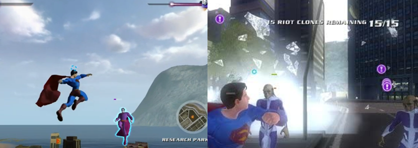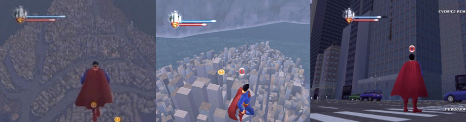 Enemies will attack civilians, set fire to buildings, and the environment is highly destructible, meaning that cars, trees, walls, and other objects and parts of the environment can be used as weapons or destroyed and, if the city is damaged too much, Superman will fail his mission and you’ll have to either restart the chapter or reload your last save. Replenishing Metropolis’ “health” can be quite a chore; you can pick up injured civilians (one at a time) and carry them to a specific ambulance to restore a bit of the city’s health but the best way to bump its health back up is to get rid of all the enemies or the threat in play or reload your last save. Unlike the vast majority of videogames, Superman Returns doesn’t appear to autosave after you complete objectives and missions; instead, you can/must manually save from the pause menu, which also lets you view Superman’s combos, statistics, and the experience points (XP) you’ve accumulated. XP is earned by defending Metropolis from incoming comets, burning buildings, and attacks from aliens, robots, and Cadmus’ monstrous creations; when you gain enough XP, Superman will level-up and his superpowers will automatically become more powerful as a result. Superman Returns features a nice little mini map on the bottom left of the screen that shows you where enemies and ambulances are located and Superman will pick up cries of distress and be able to see objective markers thanks to his super-senses. You can also view the entire city map by pressing the ‘Back’ button but this really isn’t all that helpful as no areas, secrets, or places of interest are highlighted and the only place you can fast travel to and from is the Fortress of Solitude.
