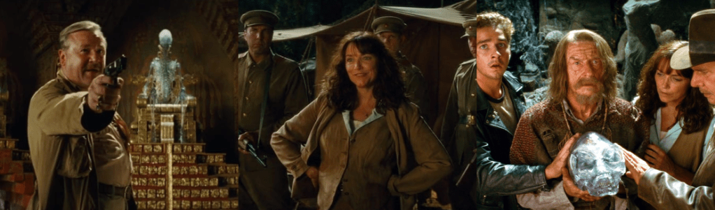 In a nice change of pace, Kingdom of the Crystal Skull uses the Soviets as its primary antagonist rather than the Nazis; while functionally not too different, the Russian antagonists rely more on subterfuge and deception that blunt execution, posing as American military personnel to force their way into Area 51 and allowing Indy to do all the heavy lifting for them. The sense of distrust and geopolitical tension between these two superpowers is best embodied by Mac, an old ally of Indy’s from the Second World War who routinely betrays both friend and foe alike, his motivations never fully known, all to serve his own ends. Mac’s constant betrayals end up coming across more as a running gag and a constant annoyance; since we’ve never seen this character before, it’s hard to care when he turns on Indy and I can’t help but feel it might’ve meant more if this had been a character like Sallah (John Rhys-Davis) who we’d had a previous relationship with. His knowledge of Indy’s methods is invaluable to the alluring and menacing Colonel-Doctor Irina Spalko (Blanchett), a cold-hearted Russian agent who seems to example some form of telepathy, or at least empathetic powers, in order to forcibly extract information from her victims. An efficient and driven individual, Irinia maintains her composure at all times, proving swift and deft with her rapier and maintaining an eerie, unblinking façade no matter what’s happening around her. With little time for Indy’s antics or pointless delays, Irina isn’t above slaughtering an entire people or threatening anyone and everyone that gets in her way, torturing Oxley and holding him captive to the point of driving him to near madness in her search for the fabled crystal skulls, with which she and her fellow comrades plan to brainwash the world into following their will. While we don’t really learn all that much about her, Irina has a strange allure to her; she and Indy have a bit of a love/hate relationship which means that actually work well together when figuring out Akator’s location, and they could’ve been allies or perhaps even lovers in another set of circumstances, but her ruthlessness and dreams of world conquest are decidedly at odds with Indy’s quest to return the crystal skull to is resting place so its masters can finally leave our world.