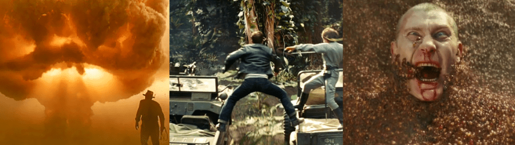 This means that Indy is even more on the backfoot than ever before which, again, is great for crafting a wily and vulnerable action hero but can lead to him looking a little foolish at times as he’s dominated by physically fitter enemies and forced to rely on pratfalls like incinerating a bunch of soldiers using a rocket engine and causing a brawl at a diner to escape the Russkies. Although I consider it an under-rated entry in the franchise, even I cant deny that Temple of Doom went a little over the top with its cartoonish humour and action sequences, but Kingdom of the Crystal Skull has it beaten thanks to two notorious set pieces. The first sees Indy stumble into a makeshift town designed to test the effects of an atomic bomb; literally at ground zero, Indy chooses to ride out the blast by shutting himself in a lead-lined fridge freezer. Somehow, despite being blasted clear across town by the resulting explosion, Indy emerges with barely a scratch on him and then immediately stops to admire the immense mushroom cloud left by the explosion, surely undoing whatever protection this tactic would’ve granted him and resulting in a sequence that’s so over the top that it may as well be in orbit! Mutt certainly follows in his old man’s footsteps in this regard; not only does he lash out at the Russians without a clear plan in mind, he’s able to put his fencing skills to the test against Irina while…somehow…maintaining his balance between two vehicles as the jungle swats at his crotch. Although he puts up a decent fight, he’s massively outclassed by the Russian, and most foes; like his father, Mutt has wiles and guts but not the greatest finesse in a fight. Given when the film was made, and the reputation of George Lucas at the time, it’s no surprise that CGI is a huge part of the film; even seemingly innocuous elements, like rodents, monkeys, and army ants are now rendered using dated and largely cartoonish computer effects rather than the tried-and-true practical efforts of the previous films. To be fair, there are many practical effects, car chases, and fight sequences that are more in keeping with the previous movies, especially when Indy and Mutt are exploring the ruins in Peru and the ancient hieroglyphics of Akator, but many of these are unnecessarily “enhanced” by ugly CGI.