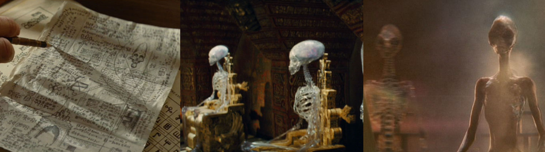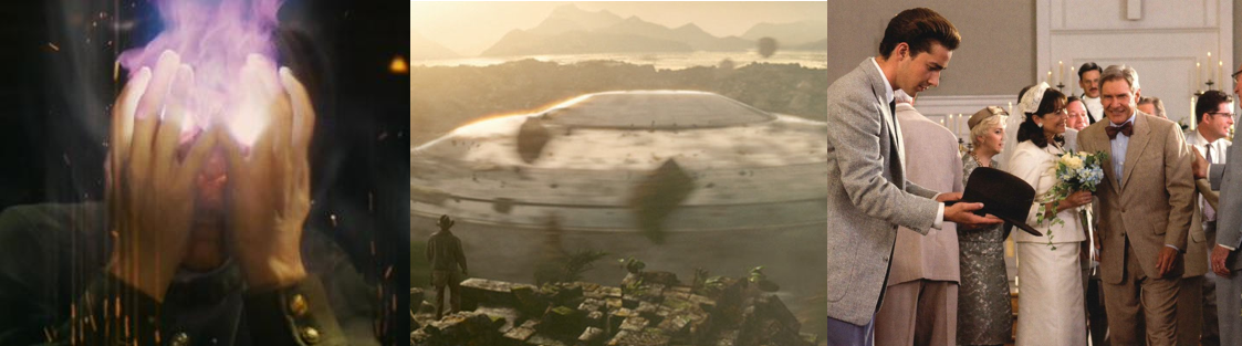 After overcoming a series of hazards each more comical than the last, including surviving three waterfalls and the aforementioned army ants, Indy and the others finally find the lost city of Akator, where they’re attacked by a tribe of savages. Thankfully, these primitives both revere and fear the crystal skull our heroes possess, allowing them to scale the overgrown pyramid-like temple and finally figure a way inside, where they’re met by a series of suitably thrilling boobytraps such as temporary stone platforms and a spike pit filled with less fortunate tomb raiders. Even Indy is awestruck by the collection of treasures held within but, while Mac loads himself up with as much gold as he can carry to satisfy his greed, Indy uses the skull to unlock a door to an impressive chamber seemingly made of gold and in which sit the crystalline skeletons of thirteen extraterrestrial visitors, one of which is missing its skull. Betrayed by Mac one last time, Indy and the others can only watch as the captivated Irinia enters the chamber and reunites the skeleton with its skull; speaking through Oxley, the creature offers to reward them and Irinia volunteers without hesitation, desperate to know the truth and the limits of the aliens’ powers and origins. She gets far more than she could’ve ever imagined, however, when the temple whirs to life, crumbling away around them; the Russkies are swept away to another dimension, Mac is unable to control his greed and perishes as a result despite Indy’s best efforts, and Irinia is so overwhelmed by the aliens’ true nature that she immolates into nothingness from the sheer awesomeness of their psychic power. Indy and the others are swept to safety by a sudden rush of water and can only watch in awe as the flying saucer disappears out of existence, the experience having returned Oxley to his senses and brought Indy and Marion back together. Indeed, after years of messing around and denying their feelings, the two finally marry in the finale, seemingly putting an end to Indy’s adventurous ways. However, as Mutt retrieves his father’s hat and prepares to don it for himself, Indy snatches it away at the last second with a cheeky smile, indicating that he’s not quite ready to pass the torch on to the next generation.