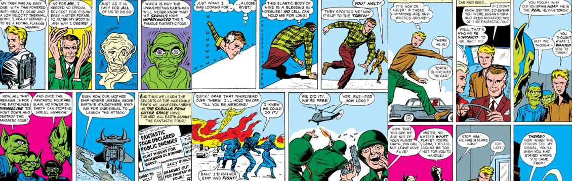 This led directly into him clashing with the more laidback Johnny, which in turn allowed Reed and Sue to be further fleshed out as the cooler heads and parental figures of the group while also exploring the guilt Reed feels for causing Ben’s condition. While I was okay with the recap of their origin as it tied into this and didn’t take up much space, the brief detour where they’re captured by the military was a bit of a waste, especially as we could’ve seen them battling the shape-shifting Skrulls instead. The Skrulls are depicted as patient and methodical; their plan isn’t to directly engage the Fantastic Four, but see to it that the world turns against them and does the work for them, though this plan is riddled with holes if you actually stop and think about it. If the Fantastic Four are their only threat, why don’t the Skrulls just use their massive fleet to attack New York City, obliterating their enemies in the process? Also, we don’t really get to see much of the Skrulls abilities or threat here; sure, they can mimic the Fantastic Four’s appearances and abilities and turn into monstrous creatures, but they’re easily defeated and their commander is duped with just a few photos and wild stories, severely diminishing whatever threat they might pose. It’s a bit of a shame, as they have a fun design and it would’ve been cool to see them showcase their power and technology in a proper fight, but it does sell the Fantastic Four as being both intelligent and physically capable. Overall, this was a pretty fun and surreal tale; it helped to flesh out the characterisation of the Fantastic Four both individually and as a group, gave them a chance to showcase a bit more of their powers and personalities, and introduced an intriguing alien race that would eventually be depicted as a far more capable menace than what is seen here. The art was colourful and popped nicely, even if the Thing and the Human Torch still look a bit basic here, and the writing was actually pretty good for a change so I’d definitely say that I enjoyed “The Fantastic Four Meet the Skrulls from Outer Space!” more than I expected.
