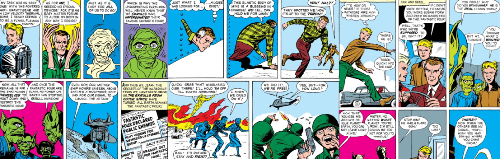 The actual Fantastic Four are off in a secluded lodge having a bit of vacation time hunting in the woods when they learn of what’s happened; while Johnny is confident that Reed will figure out who’s been impersonating them, the news report triggers the Thing, who briefly blows his lid and is ready to fight the entire human race in his mindless rage. When Reed tries to calm him down, the Thing just launches into a tirade lamenting his existence and becomes so consumed by the need to lash out that he starts to sound like Doctor Bruce Banner/The Hulk, it’s very uncharacteristic and odd to see but presumably the Thing’s personality hadn’t quite been worked out at this point. Reed assumes full responsibility for the Thing’s aggressive demeanour; after all, as his obligatory recap of their origin reminds us, he is responsible for Ben being reduced to a rock-covered monster, though none of this brings them any closer to figuring out a plan of action, meaning they’re easily surrounded and captured by the United States military. The Fantastic Four surrender peacefully and are locked up in special cells said to be capable of containing their awesome powers, though this is, of course, just an excuse to pad the story out with visual reminders of what they’re capable of: Sue easily slips out of her cell when the guards foolishly open the door to provide her with food (!), Johnny rips up the flooring to find an air vent, Reed disturbingly squeezes himself out through a single loose rivet, and Ben simply smashes his way out with brute strength in no time at all. They flee in a stolen helicopter and reconvene at one of their “many secret apartment hideouts”, where Johnny and Ben almost come to blows over which one of them will willingly sabotage a space shuttle launch to draw out their doppelgängers. Ultimately, the Thing’s rage is quelled, and the Human Torch attacks the launch site and finds himself picked up by the Skrull impersonators; Johnny learns of their alien nature and plans for world conquest and signals for his teammates, who arrive just as Johnny is facing certain destruction at the Skrulls’ hands.