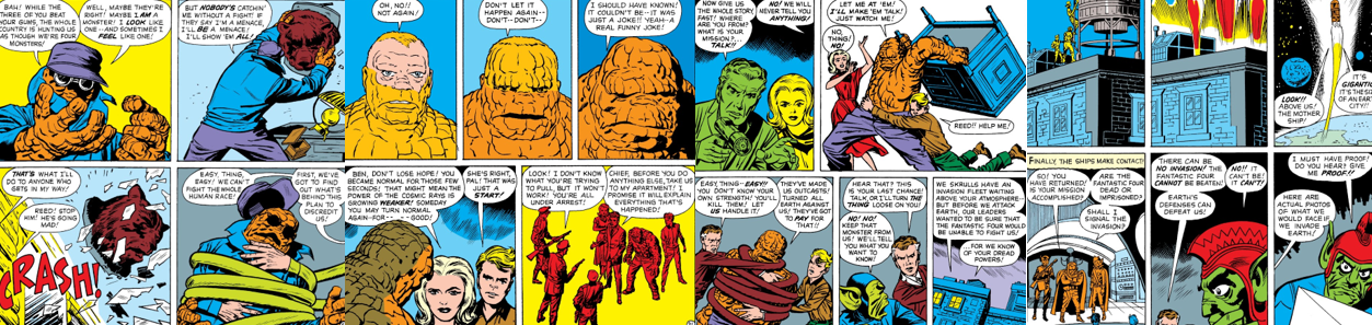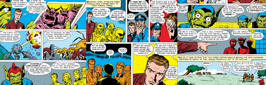 Thanks to Sue tripping one of them, Reed disarming another, and Ben’s brute strength, the Skrull are subdued and willingly spill the beans when they see the extent of the Thing’s rage towards them; the Skrulls explain that there’s a Skrull invasion fleet waiting to attack and Reed decides that their only course of action is to turn the tables on their doppelgängers by commandeering their shuttle (which is disguised as a water tower) and heading up to the city-sized mothership to try and destroy the fleet. There, they masquerade as their impersonators and tell tales to the Skrull Commander about the might of not just the Fantastic Four, but Earth’s monstrous forces, giant ants, and weaponry hidden in the atmosphere. Incredibly, not only does this dupe work, convincing the Skrull Commander to pull back the entire fleet, but the Fantastic Four are also able to avoid having to shift back to their Skrull forms with a flimsy excuse and are even awarded for their bravery when they volunteer to stay behind and remove all traces of the race from the planet. However, as the Fantastic Four are left to drift back to Earth, the shuttle happens to pass through the same radiation belt that gifted them their powers, which inexplicably returns the Thing to his normal, human form! Upon exiting the shuttle, though, they are immediately placed under arrest and Ben’s joy at finding himself human once more is immediately undone when he just turns back into the Thing within a space of a few panels. Although the police chief refuses to listen to Reed’s explanations, he and the other cops are suitably convinced when they’re attack by a giant snake, a bulbous, spiky-rock-monster-thing, and a large vulture. The Fantastic Four easily subdue these three Skrulls and are exonerated by the flustered police chief; as for the Skrulls, Reed opts not to kill them or take the chance of locking them up or to trust that they can exist amongst humans peacefully as they claim and instead decides to hypnotise them into spending the rest of their lives believing that they’re cows!