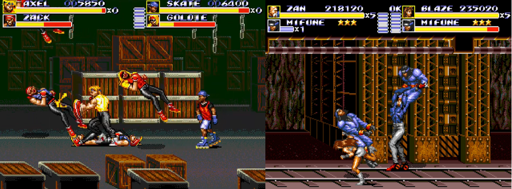 You can still perform a rear attack with A and B together (or assigning this to X, like I did) for better crowd control. You can also assign an “X Attack” (which appears to be a single, powerful attack from your combo) and you can still grab, pummel, toss, and slam enemies when you get close to them (and they can still do this to you, and can even perform co-op attacks and steal health items!) Streets of Rage 3 shakes up the roster once more; although Adam Hunter is still unplayable, he does make appearances in the game’s cutscenes, and lumbering oaf Max Thunder has been replaced by the cybernetic Zan. Axel, Blaze, Zan, and Skate continue to share the same basic attacks and controls and each again boast different skills according to five attributes (Power, Technique, Speed, Jump, and Reach). You can also see their height and weight listed in the character select screen, though I don’t think this really affects how the characters play; the other attributes certainly do, though, with Axel again being more of an all-rounder, Skate being the smallest, weakest, and fastest, and Zan having the best reach and able to zoom around on his rocket shoes but at the cost of having a shit jump and turning weapons into projectile attacks. As in the last game, each character is further separated by their different special attacks; Axel can still perform his flaming “Bare Knuckle” uppercut and spinning flaming fist, but Zan can electrocute enemies on contact and you can quickly pummel enemies with Blaze and Skate’s faster (but weaker) attacks. This time around, though, the game features a rechargeable meter; when full, your special attacks will be at their most powerful and won’t cost you any energy, and you’ll also gain a star under your life bar after accumulating high enough scores that will further power-up your special attacks. Every character can now not only dash ahead and perform a running attack (which also benefits from the star power-ups) but they can also vertically dodge out of the way with double taps of up or down, which is extremely handy when dealing with large groups of enemies.