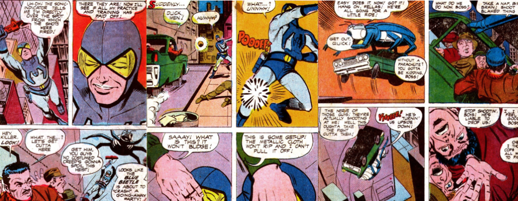 Similar to this predecessor, Ted Kord’s debut outing as the Blue Beetle begins not only with him already in the bug-themed guise of a masked crimefighter but also in the midst of a crime wave sweeping his city as the “Killer Koke Gang” make headlines for their many violent robberies. Unlike Dan Garret, however, Ted Kord’s Blue Beetle is tripped out on technology; he already has a massive, beetle-shaped hovercraft from which he can tune into sound waves throughout the city in search of trouble. When he picks up the sounds of gunshots from a nearby bank, the Blue Beetle flies into action, literally, guiding his craft through the night sky, though he strangely chooses to drop out of the craft and pilot it while hanging beneath it from a handle and wire. Although his monologue shares that he’s put in many hours of training, this is also still the Blue Beetle’s first field test and taste of real-world action; he’s so nervous about it that he almost clips a nearby building, but his presence certainly serves to put the wind up Killer Koke and his thugs.