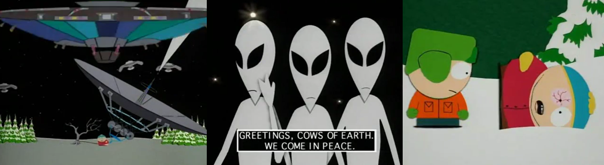 Despite this, Cartman remains unconvinced; he even refuses to believe that Kenny’s actually dead (even when Kyle pulls the boy’s head off and rats start eating his corpse) and storms off home to his mother, Liane (Bergman), and the delights of a “chocolate chicken pot pie” and Cheesy Poofs. Although Kyle pleads with Stan to help him out, Stan has problems of his own; he’s been invited to meet his crush, Wendy Testaburger (Bergman), at Stark’s Pond after school but he’s so besotted with and nervous around her that he can’t help but explosively vomit whenever she speaks to him. Kyle begrudgingly accompanies him and ends up interrupting their date when Wendy is enthralled by his story of alien abduction; much to Stan’s dismay, they end up going to get Cartman to use him as bait to lure out the Visitors rather than making “sweet love” as Chef encouraged. Cartman thus ends up tied to a tree in the middle of a forest and encouraged to keep farting until a massive alien satellite dish emerges from his ass and signals the Visitors. Kyle delivers an impassioned plea to the Visitors to return Ike, having learned that he really values the little squirt, but, when they completely ignore his appeal, he flies into a foul-mouthed rant that finally sees Ike released from their ship. The Visitors then reveal their true intentions for coming to Earth were to make contact with the cows, whom they have determined are “the most wise and intelligent” species on the planet and that their mutilation was all a mistake on the part of a severely apologetic Visitor named Carl. After leaving the cows with a special device that allows them to compel people to break into song and dance, the aliens leave, taking Cartman with them. The next day, Cartman is unceremoniously dumped back to Earth at the bus stop, where his friends are waiting, suffering from a bout of pinkeye and continuing to deny that the Visitors were real, or that he was ever abused by their unusual experiments.