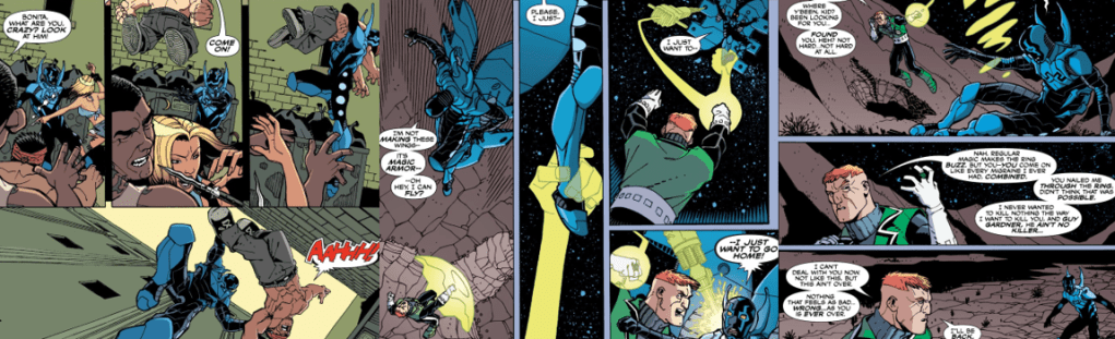 After trying, and failing, one more time to convince Alberto to let him help out, Jaime found himself set upon by Damper and three of his cohorts – the bloated Scour, diminutive Thump, and alluring Bonita – a group of street-level metahumans calling themselves the “Posse”. While the others want to take a more direct approach at making Jaime pay for hurting Probe, and Damper even subtly threatens Jaime’s family, Bonita attempts to subdue him using a combination of pheromones and feminine wiles. Luckily for the captivated Jaime, the scarab’s instincts kick in and he finds himself shielded by his alien armour, which gives him the means to fight back against them, though entirely beyond Jaime’s control, and the scarab can even detect that Bonita is pregnant. As mentioned, these three issues also chart what happened after Jaime dramatically crashes back to Earth. He was immediately attacked by hot-headed Green Lantern Guy Gardner and, since Jaime had no idea how his suit works or what it’s capable of, he was entirely at the scarab’s mercy as it instinctively formed shields, energy-based weapons, and even wings to fend off Guy’s relentless assault, all while Jaime expressed terror and confusion at the entire situation. Jaime’s inexperience allowed Guy to pound him into the dirt and drove him to beg for mercy, and Guy was horrified to find that his ring drove him to attack and almost kill a kid. This showed that scarab is perceived as such a threat by the ring that it drove Guy into a temporary bloodlust, almost driving him to the point of murder, which he claims is something he’s not known for (which is odd as I could’ve sworn Guy’s more volatile nature had seen him kill before…). After Guy left, Jaime was wracked with pain as the suit retracted into the scarab, which has painfully bound itself to his spine, and was left naked in the desert trying to figure out how to tell his mother what happened.