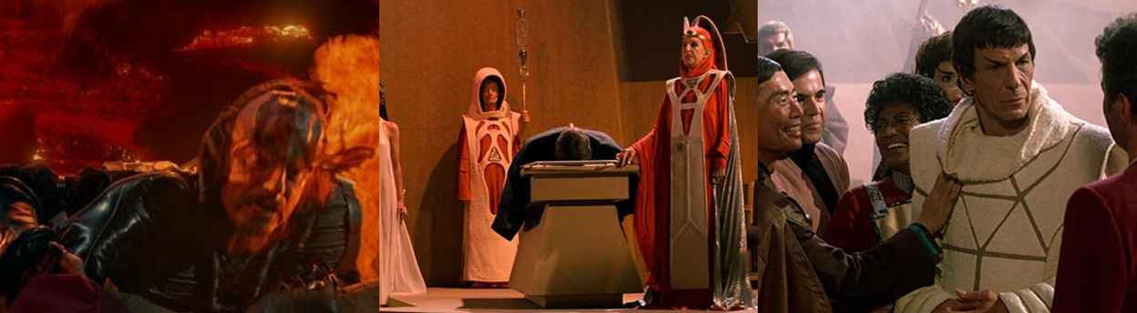 Still, the sacrifice enables Kirk and his crew to beam safely to the Genesis planet, where they’re stunned to see Spock restored and suffering from his unnatural aging. Despite the planet being ravaged by severe storms, Kirk takes the time to cover up his son’s body, and then lures the callous Klingon commander to the planet’s surface by promising him the knowledge he desires. Although Kirk convinces Kruge to beam the others to the Bird-of-Prey, Kruge spitefully refuses to take Spock along and, refusing to back down even though the planet is literally being torn apart around them, a final confrontation between Starfleet’s most celebrated commander and the vindictive Klingon ensues. Naturally, Kirk is no physical match for the superior Klingon, but he’s fuelled by a need to avenge his son and protect his restored friend; this, in addition to the constantly shifting, “exhilarating” landscape, essentially means the two are almost on equal ground. With flames and lava spewing around them and the ground cracking apart, Kirk ultimately sends his hated enemy plummeting to the molten rock below when Kruge refuses Kirk’s attempt to save his life. Feigning Klingon, Kirk and Spock are beamed to safety and his crew easily take control of the Bird-of-Prey and pilot it to Vulcan. There, much to Sarek’s dismay at Kirk’s losses and gratitude for his heroics, the Enterprise crewmen witness an ancient ritual in which a wizened Vulcan priestess, T’Lar (Dame Judith Anderson), successfully transfers Spock’s katra from Bones’s mind and into Spock’s restored body. Although T’Lar stresses that the “fal-tor-pan” poses a great danger to both Bones and Spock, the re-fusion is successful with very little fuss and fanfare and, while understandably confused, Spock soon recognises his friends and crew as they joyfully gather around him, grateful to have their companion returned to them despite the heavy price they paid.