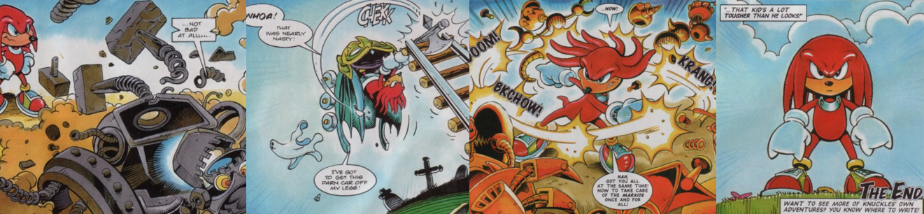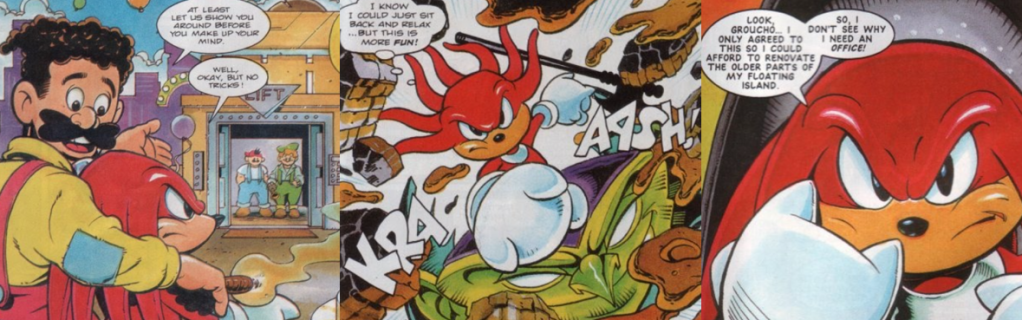 Knuckles retains much of his characterisation from his debut appearance; he’s hot-headed, proud, and incredibly naïve, easily awestruck by the ways of the surface world and manipulated by others. He is a little more guarded here thanks to being burned by Dr. Robotnik, but not so much that he doesn’t just forcibly eject the Marxio’s or that he can’t be won over by a rollercoaster ride. His focus is on safeguarding his home, however, and eradicating Dr. Robotnik’s influence from its surface; when the Marxio’s get in the way of that, and his reluctant hospitality, Knuckles doesn’t hesitate to fight back and trash their machine, but he’s not so single-minded in his vendetta as to endanger anyone’s lives. The Marxio’s have always been joke villains in StC but they work here as Dr. Robotnik’s proxies; Knuckles was never the airheaded, gullible fool in StC but many of the comic’s villains did manipulate and betray his trust, though the situation was a little different each time and he generally seemed to learn from each encounter. The primary thrust of this story, though, is to establish that Knuckles is a hot-headed loner who wants to live in peace and solitude on his island and that he’s an extremely tough physical specimen, able to glide, scale walls, and smash an entire chunk off his island with his incredibly strength. Lacking Sonic’s grating arrogance and proclivity for quips, Knuckles comes across as a bad-ass recluse who isn’t to be trifled with and who will unleash an incomparable wrath on anyone who threatens his home or tries to take advantage of him.