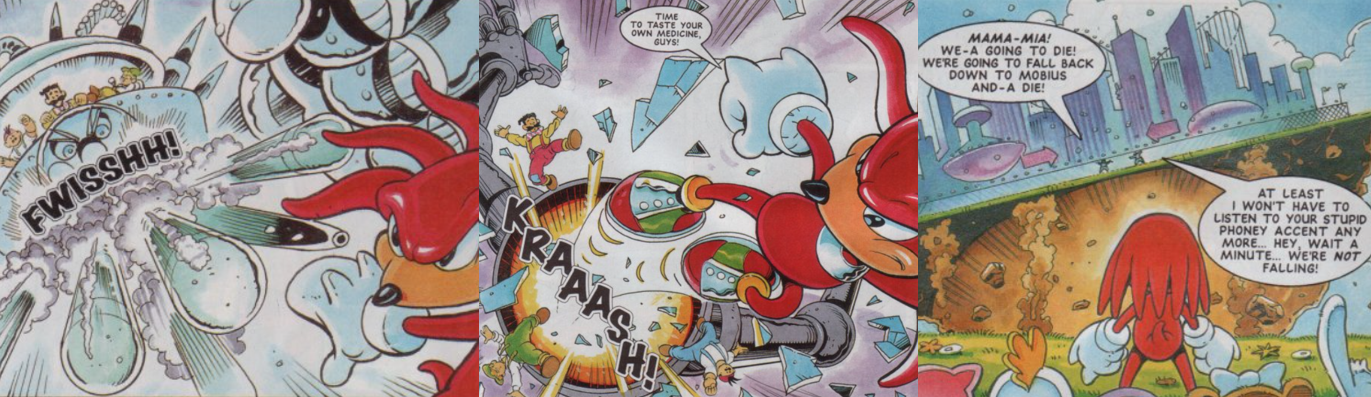 However, when Knuckles leaves to take care of Dr. Robotnik’s Launch Base Zone, the Marxio’s pursue him in their three-seater craft and Chicio accidentally lets slip that the egg-shaped dictator is bankrolling their entre endeavour. Though frustrated by his brother’s stupidity, Grouchio has no qualms about transforming their craft into a heavily-armed combat mech and unleashing its full might against Knuckles, who is summarily beaten into unconsciousness. However, right as the first guest arrive on the Floating Island and Grouchio is regaling Dr. Robotnik with their victory and promises of fortune, Knuckles recovers and redoubles his efforts, easily dodging their missiles and massive mechanical fists and tearing the craft apart with a superpowered uppercut. To stave off Knuckles’ wrath, Chicio redeems himself by calling in and hoard of Badniks and Grouchio wows the park’s guests by spinning the resulting destruction as a performance celebrating Knuckles’ victory over Dr. Robotnik. Unable to destroy the Carnival Night City with so many innocent lives at risk, Knuckles allows the Badniks to close in on him so he can destroy them all in one fell sweep and comes up with a simple, direct, and effective solution to his problem. By striking a fault line with one massive punch, Knuckles just breaks the entire Carnival Night Zone off the Floating Island! Thankfully, this severed chunk of rock contains just enough residual power from the Chaos Emeralds to allow it to slowly drop to Mobius below rather than plummeting down and killing the three, and it crashes before the startled eyes of a young boy who was unable to make the trip. With his mission complete, Knuckles orders the startled guests to vacate his island and stoically prepares to rid the Floating Island of every trace of Dr. Robotnik.