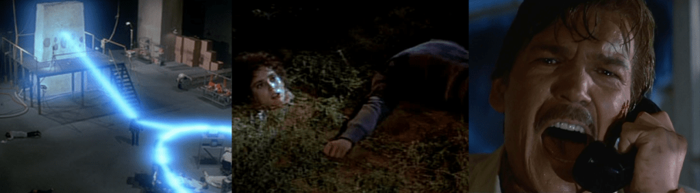 Fascinated and enamoured by the power of even a fragment of the ancient rock, Cochran delights in showing off exactly what his masks can do by forcing Dan to watch as his best seller and his family (Ralph Strait, Jadeen Barbor, and Brad Schacter) are subjected to the final Silver Shamrock commercial, which sucks the life out of the boy and sees him torn apart by bugs and snakes, which then attack his family. As kids all over the country eagerly await the “big giveaway” at nine, and Teddy is murdered via a drill to the head by one of Cochran’s androids (a scene that might’ve worked better if it had come earlier in the film before we knew for sure that they were androids…), Cochran straps Dan to a chair, fits him with a mask, and explains his motives: not only does he think it’s a lark, but he’s disgusted that people have forgotten Halloween’s roots and relishes bringing back the old ways of ritual sacrifice. With little more than an hour and ten minutes to go, Dan cuts himself free without much effort and escapes using a conveniently oversized ventilation shaft. His caricature of John McClane (Bruce Willis) continues as he sneaks across the factory roof and through the warehouse to rescue Ellie (…her door wasn’t even locked…) and he even reaches the control panel, figures out its controls, and activates the Silver Shamrock commercial without being spotted! He then dumps a load of the microchips over Cochran’s androids and equipment, shorting them both out and sending everything haywire, earning him a little appreciative applause from Cochran before he’s zapped by the rock. Fleeing from the horrendously rendered factory explosion, Dan races to interrupt the commercial, only to be attacked by Ellie, who turns out to be a robot duplicate (or…maybe she was a robot all along? Who even knows at this point!) Luckily, he avoids having his head ripped off and beheads her with a tyre iron, but we’ll never know if he succeeded in shutting off all the deadly commercials since the film dramatically cuts to the credits right as he’s desperately screaming at the television network to cut the feed…