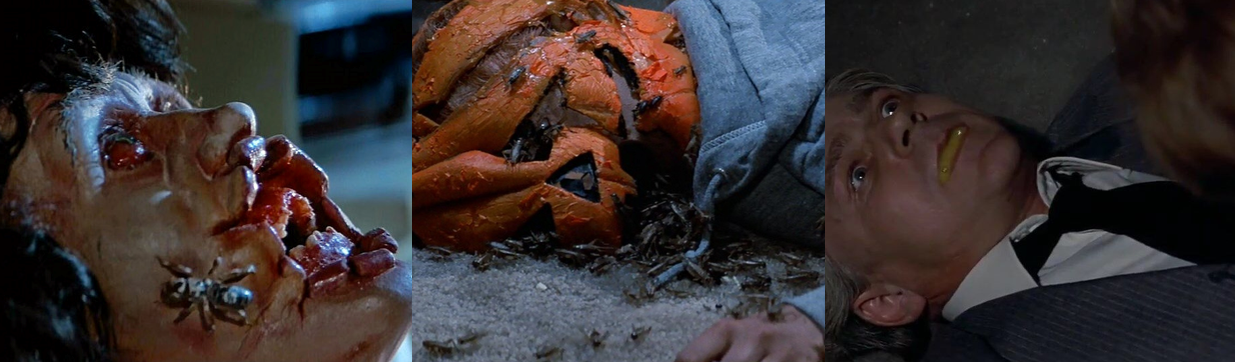 If there’s one thing Halloween III has going for it, it’s a somewhat decent sense of atmosphere; when Dan and Ellie roll into Santa Mira, they’re met with suspicion and intrigue by the townsfolk since. For the most part, the film is a bit of a murder-mystery tale, with Dan and Ellie posing as a couple and trying to find out more about the company and investigating the strange town with its many surveillance cameras and even a curfew (which doesn’t stop Dan going out at night to an open liquor store, making you wonder why there’s a curfew in the first place…), and Dan proves to be quite the sleuth. Of course, his habitual lying and infidelity goes a long way to helping with his subterfuge; Linda is so fed up of his constant excuses and lies that she offers little support or compassion when he’s rattled by the deaths at the hospital and he gets so into his little charade with Ellie that it’s not long (barely a day) before they’re getting it on in their motel room. While they suspect that there’s more going on behind Silver Shamrock’s walls, they could never have guessed the truth but we get to see it in gory detail as one of Cochran’s androids trips the head off a hobo (Jon Terry) for daring to disparage the company’s name. Disgruntled buyer Marge Guttman (Garn Stephens) also indirectly feels Cochran’s wrath after she fiddles around with a mask and gets a mouthful of laser due to a “misfire” that leaves her a mutilated husk for creepy-crawlies to wriggle out of! After Ellie is kidnapped by Cochran’s androids, Dan is fights one off, punching right through its stomach and rendering it immobile, but the realisation that Cochran utilises life-like machines leaves him shellshocked and he’s easily apprehended by the toymaker. Instead of killing the nosy doctor, Cochran decides it’s far better to take him into the hidden laboratory beneath his toy factory and to explain his master plan in minute detail (well, except for explaining how the fuck he got that chunk of Stonehenge there, which he simply laughs off).