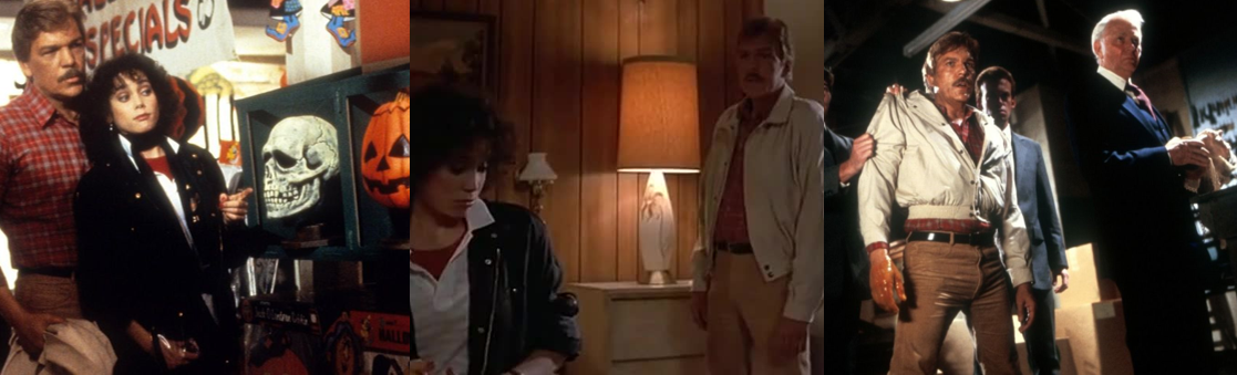 As if being consumed by a demanding and stressful job wasn’t bad enough, Dan’s relationship with his ex-wife, Linda (Nancy Kyes), is further strained by him being a borderline alcoholic. His attempts to be a good and doting father are admirable, but he’s constantly one step behind; he brings his kids, Bella (Michelle Walker) and Willie (Joshua Miller), Halloween masks but they already have two of the Silver Shamrock ones and he’s constantly being called back to work. Dan’s attempts to treat Harry are made more difficult by his ranting, which nobody notices is triggered by the Silver Shamrock commercials, and the arrival of one of the men in black, who cracks his skull through the eye sockets! For a doctor, Dan sure does enjoy extracurricular activities; while his flirtations towards Nurse Agnes (Maidie Norman) seem to all be in good fun and appreciated, it’s still inappropriate behaviour in the workplace and he seems very friendly with the assistant coroner, Teddy (Wendy Wessberg), which leads me to believe that his marriage broke down due to him being unfaithful. Indeed, after Harry is murdered and his killer immolates himself, all it takes is one look at Harry’s daughter, Ellie (Nelkin), and Dan abandons his patients and responsibilities and travels to the Silver Shamrock factory in Santa Mira, California to investigate further. Ellie is absolutely heartbroken and incensed at her father’s random and vicious murder; after spotting Dan at the funeral, Ellie tracks him down to find out more and he reluctantly reveals that Harry was paranoid that he was going to be killed. She takes him to her father’s store and shares her research into her father’s records, which points them towards Santa Mira, and Dan’s so moved by her plight that he passes up seeing his kids (much to Linda’s fury) to join her. She’s surprisingly happy to share a bed with him without much coercing (it must be the moustache because he looks old enough to be her father!…unless that’s what she’s into…) and to masquerade as potential customers to get a tour of Cochran’s factory, which is like something out of Roald Dahl. While she has a fair amount of spunk and is determined to get to the bottom of her father’s death, there’s not much to Ellie; she’s certainly not shy about her sexuality but, despite claiming to be “older than she looks”, she’s still prone to emotional outbursts and is thus easily captured by Cochran’s men, disappearing for a big chunk of the film and returning simply to be a pretty hostage for our surprisingly gung-ho male protagonist to rescue.