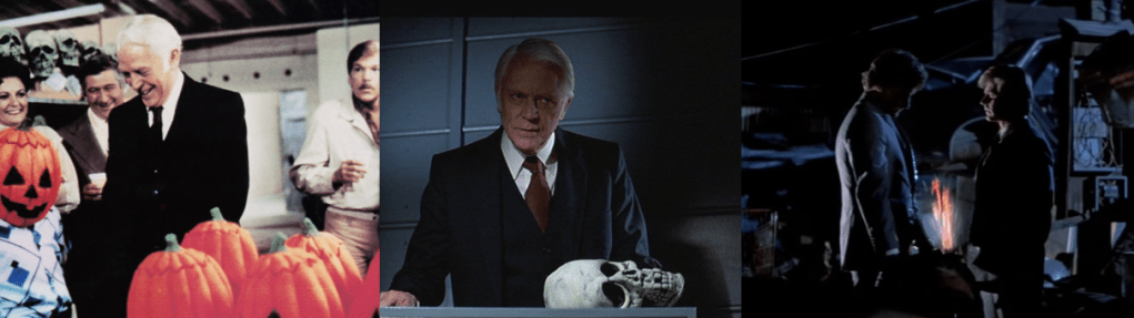 This one’s a tough one for me. Unlike, say, the Friday the 13th series (Various, 1980 to present), which potentially could’ve lived on (at least for a film or two) with other killers donning the iconic hockey mask of Jason Voorhees (Various), I’m not entirely certain if Halloween was meant to involve anyone or anything other than Michael Myers. I think maybe if the second film hadn’t been a direct sequel then this anthology format might’ve had more legs, but it feels weird to do two Myers-centric movies and then suddenly veer into anthology territory. Honestly, more than anything I’m surprised it got made at all; the idea of producing a horror sequel without its main villain and with no ties to the previous movies seems unusual today but even more so back in the eighties, when horror franchises were churning out yearly films featuring their popular slasher villains. Although Myers was very clearly and definitively killed off in Halloween II, it took the bare minimum of handwaving to explain his return in subsequent films, and I’m genuinely baffled that the producers didn’t simply accelerate that logic for a Carpenter-less third movie and produce this film as a separate endeavour, but clearly it was an attempt to cash-in on Halloween’s success and placate John Carpenter, because why wouldn’t you want him around? The film begins in October, some eight days before Halloween, and finds shop owner Harry Grimbridge (Al Berry) pursued by mysterious, stoic men in suits. Exhausted, hurt, and clutching one of Silver Shamrock’s coveted Halloween masks, he’s barely able to escape and is taken to a hospital, where he’s placed under the care of Dr. Challis.