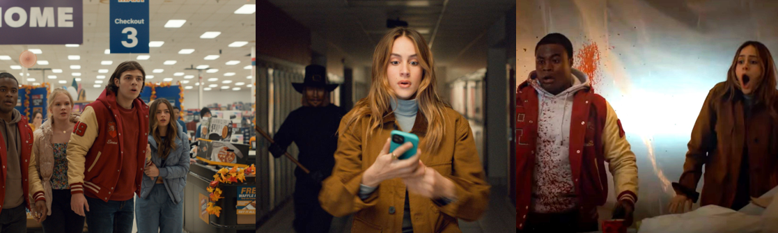 We don’t have Thanksgiving here in the United Kingdom for…obvious reasons…so I’ve always felt a bit of a disconnection with the famous American tradition. Much like the Fourth of July, it’s a celebration I always feel I’m missing out on as I love a good excuse to sit around and stuff my face with food, so I was a little wary of Thanksgiving simply because I just didn’t have that investment in the holiday (or the concept), and the visual of a John Carver/pilgrim-themed killer didn’t strike me as very intimidating. Still, the trailer intrigued me as a throwback to the mindless slashers of old and I’ve enjoyed a lot of Eli Roth’s work, so I was wiling to give the film a shot, if only to fill a spare day with a cinema trip and to have a Thanksgiving-themed review to link back to year after year. The film begins with a lengthy cold open that establishes not just the core group of characters for the movie – principally the influential Wright family, their daughter Jessica (Verlaque), and her group of friends – but also the inciting incident for the entire plot of the movie, that being a chaotic Black Friday sale at Thomas Wright’s (Hoffman) bustling mall, RightMart. The scenes of the townsfolk yelling and shoving and growing increasingly aggressive to enter the store and grab their reduced purchases (and be in the first hundred shoppers to nab a free waffle iron) are particularly striking as they’re all-too-realistic in this day and age, where “Black Friday” lasts about a week and people really do fight, trample over each other, and act like complete assholes just to get a cheaper coffee maker. This subject could be a horror movie all on its own, but it acts as a prelude to the focus of this film, establishing animosity between Jessica’s jock friend Evan (Sanelli) with football rival Lonnie (Mika Amonsen), an unrequited love triangle between Jessica, her boyfriend Bobby (Brooks) and lovelorn loner Ryan (Milo Manheim), and showing Jessica’s resentment towards her stepmother, Kathleen (Karen Cliché), who is partially responsible for the ensuing violence as she insisted on opening the store that night.