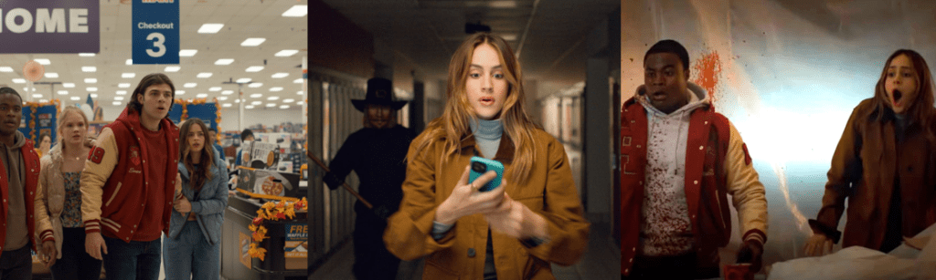 It didn’t take long into Thanksgiving for me to make a couple of immediate comparisons; the general concept of a masked killer stalking “teenage” victims is reminiscent of John Carpenter’s Halloween (1978), while the more modern iteration, with the sexy cast who feel responsible for a tragedy, harkens back to I Know What You Did Last Summer (Gillespie, 1997). It’s this latter comparison where my thoughts on the rest of Jessica friends land: Gabby is basically a forgettable blank slate who doesn’t even add to the body count, much less the plot; Evan is a loud-mouthed jock who bullies other students into doing his assignments and whose first instinct is to puff out his chest and antagonise others; Yulia is another warm body on the screen who is brutally offed just as she’s about to become interesting; and “Scuba” (Davenport) doesn’t become anything other than a slightly more level-headed jock until the third act and even then he doesn’t have the good sense to get eviscerated to help raise the stakes. The group are united in their desire to move on from the Black Friday massacre and their dislike of Ryan, an awkward kid whose lust for Jessica is readily apparent. Even after Jessica relents in the time jump, having been burned by Bobby’s disappearing act and become grateful for Ryan’s dependency and affection, the group struggles to accept him. Similarly, they’re largely dismissive of McCarty (Joe Delfin), the son of a gun store owner who’s constantly badgering them to come to his party-come-orgy and sell them firearms, something both Scuba and Jessica are vehemently against because of the escalation of gun violence in high schools and Jessica’s past experiences with guns. Still, as forgettable as many of Jessica’s friends are, the film does a good job of setting many of them up as red herrings; since his baseball career was delayed and endangered by the riot, Bobby has a great motivation for revenge, as does Evan, whose constant lashing out paints him as unstable, and Ryan, who’s constantly portrayed as being a little “off” and forceful.