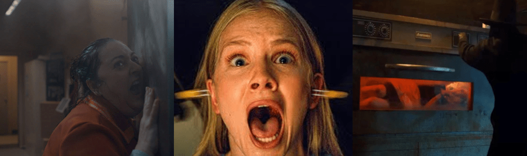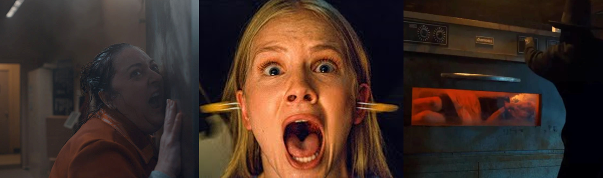 That seems to be the perfect segue to talk about the film’s kills. The opening sequence sets a high bar and I’m sure will go down in history infamy as one of the all-time great horror openings as rabid shoppers trample over each other and clutch at their products even as they’re being beaten or bleeding out. Naturally, it’s Amanda who comes out the worst in this scene, getting her neck broken by two clashing trolleys and then part of her scalp torn off when her hair’s caught in the wheels. John Carver’s first victim, Lizzie, endures a fair bit of torture as she’s splashed with water and partially frozen against a freezer door, tearing the skin from her fingertips and cheek before she’s unceremoniously split in two by a rubbish bin and her bottom half (guts and all) is displayed outside the RightMart. Manny’s end is more simplistic in comparison, with him being stabbed and then having his head severed by a wire, but Yulia’s death is the obvious highlight. Held at knifepoint by Carver, who’s confronted by a gun-wielding Scuba and Jessica, Yulia is suddenly and violently disembowelled by a buzzsaw. While this is an admittedly gory and brutal kill, it does feel quite random; without an earlier scene to establish that Yulia’s house is undergoing renovations, it lacks some of the punch it might’ve had if this instrument had been established earlier. Similarly, while Lonnie is offed by a sudden and impactful head twist, his cheerleader girlfriend, Amy (Shailyn Griffin), makes up for this with a creative kill where she’s repeatedly stabbed while bouncing on a trampoline. Although Kathleen makes a good go of escaping from Carver, she’s impaled by a pitchfork and shoved into a massive oven, which cooks her alive in unspectacular fashion, though Roth’s gross-out sensibilities quickly rear their head when she’s served to Carver’s other victims and Carver bashes Evan’s brains out, on livestream, with a meat hammer. Unfortunately, again, I feel we were denied a few more victims; sure, Carver lops off a kid’s head with his axe, but there was really no reason for Gabby, Scuba, or Thomas to live, especially as they weren’t all that memorable to begin with, ridiculous moustache or not. I was sure that Scuba was going to meet his end when he fought Carver to cover Jessica’s escape, but he made it out with only a flesh wound and the others were just rescued offscreen by the cops, denying us a higher body count and more gore.