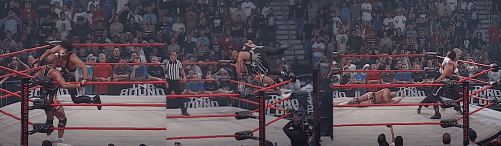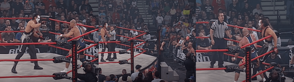 Angle then scored with the Olympic Slam but the referee was busy dealing with Karen so he was a little too late for the count, meaning Sting kicked out. Angle then sat Sting on the top rope but, while Sting was able to fight out of a belly-to-belly suplex, his attempt at a diving splash saw him eat nothing but knees, though he still kicked out of the pin. Angle then planted Sting and hit this trippy somersaulting knee drop, like a version of the 450 Splash, but it still only got a two count. Frustrated by Sting’s tenacity, Angle went for the Ankle Lock again, this time right in the middle of the ring; Stin rolled out and sent Angle flying into Nash. However, when Sting ducked Angle’s wild clothesline, referee Rudy Charles got taken out and thus Sting was left frantically motioning for a new referee after planting Angle with the Scorpion Death Drop. Referee Andrew Thomas tried to make the three count but Nash yanked him out of the ring and punched him out before putting a beating on Sting in the corner. Sting took both Nash and Angle down with a double clothesline, however, but got a good ol’ shot to the nuts from Angle for his efforts. Tenay tried to say that Sting managed to block a shot from Angle with his own baseball bat but he clearly wasn’t fast enough as you can see the bat hit him and he ends up bleeding as a result. Still, Sting snatched the bat away and busted Angle open before finally taking Nash out of the equation. Sting then hit another Scorpion Death Drop and Rudy Charles came around long enough to make the final three count, thus awarding Sting another World Heavyweight Championship, much to the delight of the crowd, the announcers, and Sting himself. Sadly, though, this was quite the lethargic affair; considering the two had a bit of a grudge heading into the match, the energy was lacking and it was a very slow and by-the-numbers affair, possibly to cover for Sting’s limitations and Angle’s physical issues. Both guys seemed to get winded very quickly and the referee bumps and interference weren’t really necessary, and the whole contest felt like it was on the verge of kicking into a higher gear but just never got around to it.