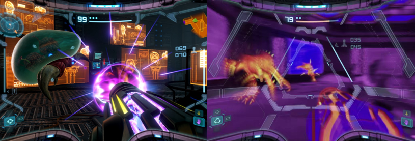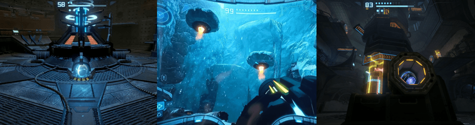 Graphically, Metroid Prime Remastered is very impressive; I’ve never played the Metroid Prime games before and am always a bit wary of first-person shooters, but the game looks amazing, including some striking atmospheric effects to add to the immersion. Samus’s visor mists up, rain splatters against it, her reflection appears when lightning flashes, and you’ll hear here grunt in pain whenever she takes damage. Although many of the environments can become stale, especially those set in futuristic labs or comprised of metallic hallways and rooms, Tallon IV is a very diverse alien world, including rainswept ruins, dark caverns, frigid cliffs, and volcanic caves. Each area is connected to each other by a series of lifts, meaning you’ll have to pass through the Chozo Ruins to reach the Magmoor Caverns to access the Phendrana Drifts and explore a submerged ship to reach the fungus-infested Phazon Mines. Environmental hazards are rife in each area, as are the relics of the Chozo civilisation, with statues and runes left behind to guide you as much as the literal ghosts of the past appear to test you. As you upgrade your abilities, you’ll be able to access new areas of each environment, traversing tunnels, platforms, and Space Pirate facilities built into each. Here, you’ll find computer stations and biological experiments housed in glass chambers that will break free to attack you.