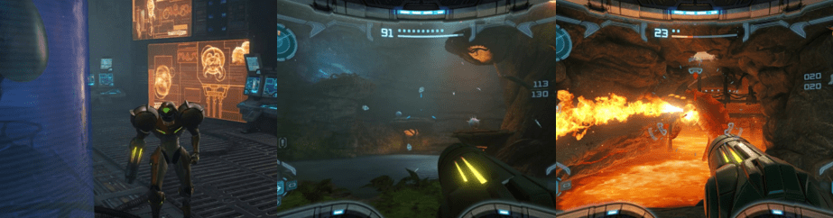 Samus can also upgrade her arm cannon to fire various additional blasts, missiles, and streams of elemental energy; these are required to open certain doors, destroy certain objects, and defeat certain enemies, all of which are usually colour-coded so you know which weapon to switch to using the X button in conjunction with the directional pad (D-pad). Samus can fire regular missiles and, eventually, unleash a barrage of Super Missiles in addition to a flamethrower, freezing stream, and a burst of electrical energy, all of which require missile ammo to utilise. Thankfully, defeated enemies and destroyed crates will drop orbs to replenish your health and ammo for these weapons, both of which can also be upgraded to increase your maximum health and ammo capacity. Samus also has a high-tech visor that allows her to scan her enemies and the environment, adding them to her Log Book (essentially unlocking character models and other goodies in the ‘Extras’ menu) to help you combat enemies or traverse the environment. Later, Samus acquires upgrades to her visor that allow her to see in infrared and utilise an x-ray vision, exposing hidden platforms and heat signatures to find new paths. You can switch between these with the D-pad, a system I found rather cumbersome as there was a noticeable delay when switching visions and I often accidentally changed my vision when I was trying to change my weapon, temporarily disorientating and blinding me. Samus’s abilities only increase as you explore, adding a grapple beam to her arsenal that allows you to swing across gaps with ZL when prompted, drop more powerful bombs to open new passageways, and freely move when underwater or survive the intense heat put out by the Magmoor Caverns and Phazon Mines.