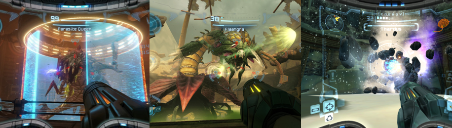 Tallon IV is home to several insectile enemies that will chip away at your energy or exist primarily to annoy you or be farmed for health and ammo; wasp-like bugs, swarms of insects, plant-like enemies, and literal balls of plasma are commonplace, with even some of the smaller enemies being impervious to your standard cannon and requiring upgrades to finally take them out. Some, like the Reaper Vines, are virtually indestructible and simply disappear for a bit before whipping back out at you; others, like the Stone Toads, exited solely to aggravate you as you struggle to build enough momentum to reach higher levels. Some enemies, like the Baby Sheegoths, Jelzaps, and Plated Beetles are heavily armoured and can only be damaged from behind or when they expose their weak spots; others, like the various burrowing insects and the dragon-like Magmoor, burst up from the ground, ice, or lava to attack you. As you progress, you’ll encounter several different Space Pirates (known as “Troopers”); these slash at you up close or fire at you from a distance and come in different colours, rendering them weak to your different cannons but also allowing them to appear invisible, cling to ceilings and walls, and afford them greater mobility in the air and underwater thanks to their jetpacks. By far the worst and most annoying regular enemies are the Chozo Ghosts (which do become easier once you gain additional visors, but the reduced visibility meant I often just ran past them) and the various Metroids. These jelly-like bastards attach themselves to you to drain your energy, can multiply when damaged, and even take on coloured forms to force you to switch weapons and appear in more aggressive octopus-like variants. They can also absorb a great deal of damage, meaning it’s often easier just to try and avoid them and rush to the exit.