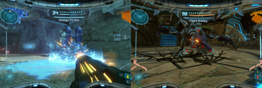 As Samus explores the laboratories and facilities hidden on Tallon IV, she will also be attacked by larger, more aggressive Space Pirates. The Phazon Elite is a Space Pirate empowered by Phazon and, like the Elite and Omega Pirates, wields a massive energy cannon on its shoulder. All three of these can absorb your Charge Beams and unleash a shockwave attack, but sporadically prove vulnerable to your Super Missiles; the Omega Pirate variant also sports a cloaking ability, plasma cannons, and limited regenerative capabilities, but all three are surprisingly easy to take down thanks to you being able to target their cannons with your thermal vision. In comparison, their leader, Meta Ridley, is quite the foe; after collecting twelve Chozo Artifacts, you’ll engage in an intense battle with Ridley that sees him flying overheard and far out of range, raining fireballs and breathing fire at you and charging at you to deal massive damage. You can take cover behind the stone columns, but Meta Ridley’s ranged and melee attacks will destroy these, and the only way to damage him is to fire Super Missiles right before he unleashes his flame breath. A huge hurdle here is your ammo; if you run out of missiles, your primary charge beams will only chip away at Meta Ridley’s health bar, so it definitely pays to upgrade your energy and maximum ammo.