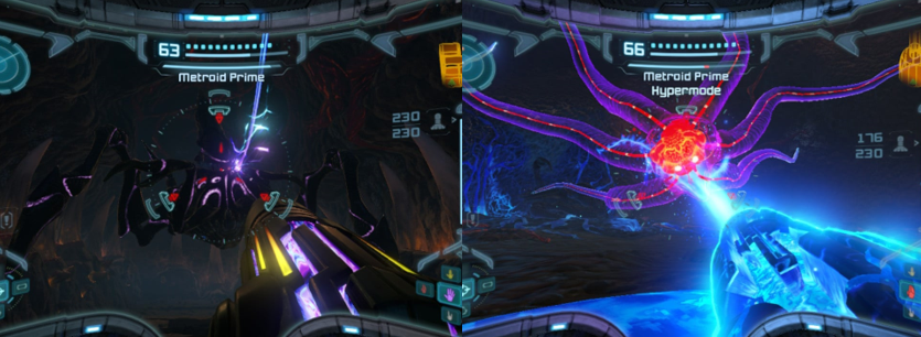 This is also true of the game’s final boss, the titular Metroid Prime. Before you can even reach this spider-like grotesque, you’ll have to endure an aggravating obstacle course through lava and caustic Phazon, dodging Metroids and hopping to platforms and magnetic rails with only one save station right at the start of the endurance round. Metroid Prime is fought in two phases; in the first, it is protected by a hard outer shell that sporadically cycles between different colours, meaning you’ll have to quickly switch your weapons to deal damage. Again, your charged beams won’t do much so you’ll be relying on your Super Missiles and more powerful attacks like the Wavebuster and Flamethrower but, luckily, Metroid Prime’s projectiles can be destroyed to replenish these (and, occasionally, your health). Metroid Prime is a hell of a challenge, drawing you in with a tractor beam, raining explosive plasma, firing a sustained, powerful laser, spitting toxic balls, and scuttling at you, meaning your only way to avoid damage is to use the clunky dodge move and Morph Ball. After battling it down several layers to the planet’s core, it’s outer shell will shatter for the second phase, exposing Metroid Prime’s luminous, Lovecraftian, octopus-like true form. In this state, it charges up a shockwave attack that can be tricky to jump over and spawns various Metroids to distract you. It also cycles through different stages of invisibility depending on which visor you have, meaning you need to frantically change your vision mode to find it, though it’ll remain completely immune to your attacks until it starts leaking Phazon. You can temporarily use these pools to enter “Hyper Mode”, allowing you to finally deal some damage, but you’ll need to repeat this process a few times to finally end it, which can be an aggravating task thanks to the Metroids, the great range of attacks, and the clunkiness of switching between your vision modes.