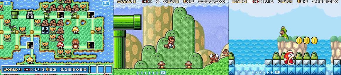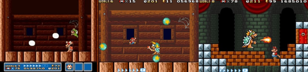 Sadly, this disappointment also extends to the Koopaling you encounter at the conclusion of each Airship. Each Koopaling wields a magic wand that fires a projectile into the cramped arena and jumps around, often retreating into their spiked shell to protect themselves, and can be defeated in three hits. While Wendy O. Koopa and Iggy Koopa can jump a little higher than others, which can mess up your attack strategy, Roy and Ludwig von Koopa can stun you by creating earthquakes, which leaves you vulnerable to their slow magic projectiles. Wendy and Lemmy Koopa are probably the most unique and memorable of the seven as Wendy fills the screen with candy rings that bounce all over the place and Lemmy rolls about on a magical ball firing smaller balls that can hurt you or be used as platforms to avoid his erratic rolling and bop him on the head. Again, though, while each of the Koopalings looks different and has slightly different attack patterns, they’re all basically the same; if you can reach them with a Fire Flower or Hammer Suit then you’re laughing, but the hardest thing about most of them is that you have the suffer through the entire Airship course all over again if you die fighting them. Their father, Bowser, appears only as the final boss of the game; after enduring some of the game’s hardest Levels, defeating more Boom Booms and dodging a whole host of enemies and hazards, you’ll reach Bowser’s Castle, a maze-like shrine to the Koopa King with branching and looping paths and lava pits. Bowser himself spits fireballs at you that you must duck or jump over and will leap into the air to crush you with a butt stomp; simply dash underneath him and cause him to destroy some of the blocks. Do this three times in the same area (or manage to blast him with enough projectiles) and he’ll plummet to his doom, leaving you to free Princess Peach and restore the peace to the land. You’ll also battle him twice more in World-e, with one battle being functionally the same and the second being made harder by the presence of unbreakable blocks included on the floor.