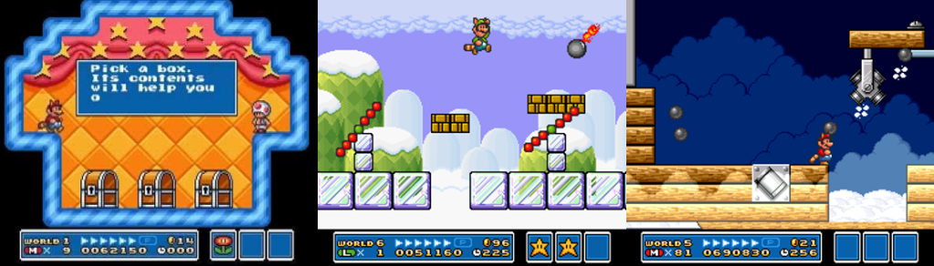 While many of the game’s hazards and enemies will inevitably repeat, they are often used in creative and more difficult ways later in the game, from simple stuff like mixing different enemies into the Levels to more annoying inclusions, like constantly respawning enemies or platforms coming to life beneath your feet, or having to bounce perfectly off music note blocks and run across falling platforms. You’ll sometimes have to swim underwater, tapping A or making use of the Mario’s new Frog Suit power-up to more efficiently bypass Cheep-Cheeps and Bloopers; other times, the Levels autoscroll horizontally, vertically, and diagonally, putting your reaction times and platform skills to the test. There are also a number of looping mazes, often involving pipes or the lava-infested Fortresses, with some having exits so obscure that you’ll have no choice but to consult a guide (World 6-5, for example, traps you in an endless loop and forces you to awkwardly fly up a specific part of the stage using the Raccoon Suit while holding a Koopa shell to break through some blocks and reach the exit, none of which is very intuitive). As if the small platforms, singular blocks, and broken bridges aren’t bad enough, you’ll also have to contend with projectiles, blocks coming to life, timid ghosts who chase you when your back is turned, bottomless pits, instant-death lava, temporary moving platforms that you must jump on to change their direction to progress upwards, suffocating quicksand, leaps of faith, and treacherous platforming nightmares up in the clouds. Thankfully, you have infinite continues; when you lose all your lives, you can continue on with a fresh stock, though your score resets to zero. You’re prompted to save your game after clearing every Fortress and Airship, though you can manually create a temporary save at any time from the pause menu if you need to take a break. Gameplay is mixed at the Toad Houses, where you play various mini games for power-ups and extra lives; these reset after you lose all your lives and continue your game but can be really tricky. One sees you having to stop sliding tiles at just the right time, which I found all-but impossible; one sees you turning over cards to find doubles; the other has you picking from three chests; or you can fight a couple of Hammer Bros. to earn a chest containing a random power-up.
