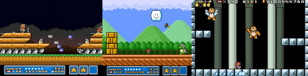 After being disappointed by the lack of power-ups in Super Mario Bros. 3, I’m happy to say the Super Mario Bros. 3 goes above and beyond with its power-ups! Staples such as the 1-Up Mushroom, Super Mushroom, and Fire Flower return, granting an extra life, an extra hit, and the ability to throw fireballs, respectively, alongside Coins that grant extra lives when 100 are collected and the Starman, which grants brief invincibility. Super Mario Bros. 3 also debuts some brand new power-ups that have since become franchise staples, such as the warp whistle and cloud that will teleport you across the overworld, Blue Coins (though they have no additional value), hammers to break overworld blocks, and a music box to send enemies to sleep in this same area. Mario and Luigi also have some new forms here, such as the Frog Suit (which allows greater movement when underwater at the cost of impeding land movement), the Hammer Suit (which lets you toss a bunch of hammers and protect yourself from projectiles and the cost of sliding down hills), and by far my favourite Mario power-ups: the Super Leaf and Tanooki Suit. These grant you cute little raccoon ears and a tail (or a full raccoon suit, respectively) that lets you attack with a tail swipe, flutter jump by tapping A, and fly through the sky after building up enough speed. Pressing down and B while wearing the Tanooki Suit also transforms you into a statue to avoid damage from enemies and projectiles, and you can fly indefinitely when awarded with a P-Wing, easily allowing you to soar over the game’s more troublesome sections. There’s also an additional, somewhat secret power-up in the game; if you defeat a the shoe-wearing Goombas in World 5-3 in just the right way, you can hop into the shoe and safely pass over spikes and defeat spiked enemies, all while retaining any other power-ups you already have.