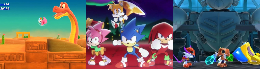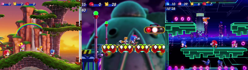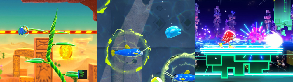 Sonic Superstars doesn’t buck tradition; it’s a 2.5D, sidescrolling action platformer just like the classic 2D Sonic games and with all the traditional tropes you’d expect returning. You take control of one of four familiar faces and race through twelve colourful levels (known as “Zones”), each with anywhere from one to three stages (or “Acts”) within them, freeing woodland critters from Badniks, collecting Golden Rings to stave off death, pinballing all over the place on springs, bumpers, and boost pads, and striving to blast through Acts as quickly as possible. However, unlike in the classic games, you’re no longer penalised if you take more than ten minutes to finish an Act; the timer simply runs out and the game continues, which is good as some of the later bosses take at least ten minutes to battle against, so you’d be dying over and over to time outs if they were still a thing. Another noticeable change is the complete absence of a life system; you’ll hit Star Posts to create checkpoints across each Act and you’ll respawn at these when you inevitably die, but you won’t ever have to worry about running out of lives or continues or getting a game over, which again is good as some of the later Acts and bosses will see you crushed, zapped, or plummeting to your death to an almost spiteful degree. Otherwise, many of the same mechanics are here; you’ll suck in air bubbles to avoid drowning, run through loops, crash through walls, and take multiple paths through each Act, with the higher route usually being the fastest but most dangerous, to finish faster or find goodies. Like Sonic 3 & Knuckles (SEGA Technical Institute, 1994, Sonic Superstars uses save files for your playthrough (though, oddly, you can’t copy your save file) and, like Sonic Generations (Sonic Team, 2011), you can run around a limited hub world between Acts where you can access Acts, bonus Acts, switch characters, and play some tutorials to get to grips with the game’s new mechanics.