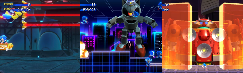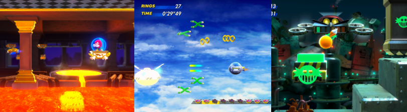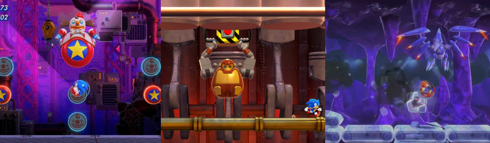 Like in Sonic 3 & Knuckles, many Act 1’s end with a battle against one of Dr. Eggman’s larger mechanical monstrosities. The first of these is the Mosasaurus, though this is more of a chase; you can hit it when it leaps into the foreground, but just run to the right, avoiding pits, and it’ll crash into a wall, defeated. In Speed Jungle Zone, you face a giant mosquito-bot that can only be damaged by Spin Dashing up the chain it shoots at you. You’ll have to watch for spike pits, projectiles, and its charge attack near the end, too. Pinball Carnival Zone pits you against a maniacal clown merged with a giant bumper; this thing will float around dropping explosives and shielding itself with electricity, and the only way you can make it vulnerable is to jump at the tokens in the arena to flip it around, with these (and the hazards) increasing as the battle progresses. Lagoon City Zone’s robotic guardian is a giant jellyfish that spits out a bunch of minions to distract you, fires its tentacles at the floor, and then electrifies the water you’re standing on before trying to crush you. As you damage it, it’ll also fill the screen with projectiles and strike with multiple limbs. Press Factory Zone’s giant mechanical ape harkens back to Sonic 1’s Final Zone boss; when in the background, it causes giant pistons to come crashing down on you, so you need to find the safe spot to avoid being crushed then wait for it to finish jumping about in the foreground so you can ram it, not unlike the Flying Battery Zone boss battle. Golden Capital Zone’s robot pig can be a bit tricky as it sucks up all your Rings at the start of the fight but it’s actually pretty simple; just race around the rotating arena as it charges you until you can hit the big button on its back, something made ridiculously easy with Tails or Amy thanks to their greater air time. Finally, Frozen Base Zone sees you running along (and against) conveyer belts and battling a bird-like mech that spits targeted mines, ice cubs, and other Badniks that must be avoided before you desperately try to jump up and hit it before it disappears to the background again.