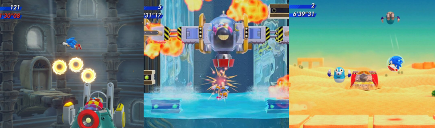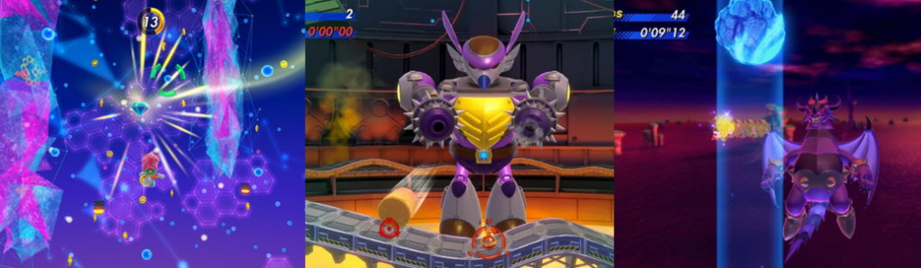 Of course, Dr. Eggman isn’t the only baddie in Sonic Superstars; you’ll encounter Fang quite a lot, taunting you or firing missiles and lasers at you, completely out of reach until you reach Golden Capital Zone, where you battle him in an autoscrolling section. Piloting a weaponised version of the Marvellous Queen, Fang fires lasers at the ceiling and lava, causing debris to fall and lava to rise, fires three more lasers from drone-like appendages and shields himself with destructible hexagons. Between each encounter, you must dodge flame plumes and falling lava; Fang’s projectiles and dangers increase as the fight drags on, too, making this a hell of a chore. After a battle against Dr. Eggman’s prototype Metal Fighter (which is the “Battle Mode” avatar you created) that draws from the classic Metal Sonic battle from Sonic CD and the Death Egg Zone boss from Sonic 3 & Knuckles (but with more pits and less Rings), and a shoot-‘em-up battle against two redesigned Fantasy Zone bosses (one a cylindrical mech that spits bullets, the other a sphere resembling Dr. Eggman’s face that rains projectiles) and working your way back through Egg Fortress Zone, you’ll have a climatic two-stage battle against Dr. Eggman’s biggest mech yet. In the first phase, you run around a circular platform devoid of Rings dodging his missiles; run around the mech and hit the blue missiles to score a hit, but don’t bother from the front as it’ll block them. The mech also swipes at you with its buzzsaw-like arms and fires an energy wall that you can avoid by jumping through the gap and, after enough hits, it’ll switch to attacking from the foreground (again, like Sonic 3 & Knuckles’ Death Egg Robot). This is the toughest phase of the boss as you need to avoid falling, dodge his hand smashes, hide behind any nearby walls to keep from being trapped in his anti-gravity beam and roasted by his projectiles, and must to dodge the multiple giant lasers, all while striking at a precise moment to land a hit. This becomes especially frustrating as there are no Rings in the arena, no checkpoints between phases, and the fight drags on and on since it takes so long between each attack and before you can land a hit.