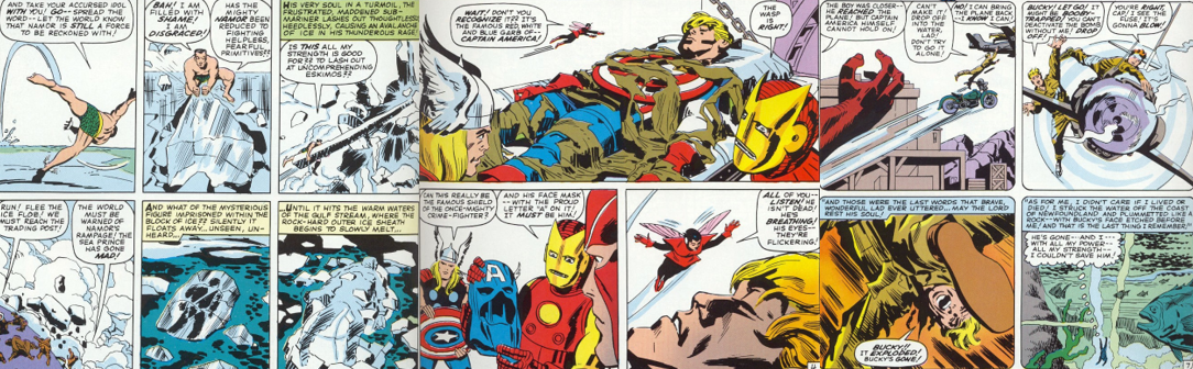 Marvel Comics always liked to hype up their stories and issues back during this time period; front covers would proclaim even the most bizarre-looking characters as being must-see events and issues generally always featured celebratory mentions of the creatives involved, and The Avengers #4 is no different. There are a couple of notable unique features in the full-page title splash for this story, though; first, a big explosive bubble of text directly attributes the return of Captain America to an “avalanche of fan mail” and a dialogue box at the bottom of the page makes sure to mention that “glorious” Stan Lee and “grand” Jack Kirby both collaborated on Captain America’s debut story, thereby lending further prestige to his return to the then-modern era of Marvel Comics. The story itself takes a little while to get started as the first page of panels is dedicated to recapping the Avengers’ battle against Prince Namor McKenzie/The Sub-Mariner and the Hulk in the previous issue; after the Hulk disappeared, Namor was forced to flee from the overwhelming odds and returned to the depths of the ocean. The sting of defeat is great for the proud Mutant but pales in comparison to the frustration he feels at being abandoned by his people after the inhabitants of Atlantis questioned his loyalty. Vowing to never stop searching for his lost people, Namor finds himself lost amidst the frozen wastes of the North Sea, where he comes across a tribe of Eskimos who worship a mysterious figure frozen in a block of ice. Interestingly, despite the Eskimos being isolated from the rest of the world, they instantly recognise “the dreaded Namor”, who wastes no time in mocking their idol and turning his anger upon them. In his rage, Namor decimates the frozen landscape, terrorises the simple folk, and hurls their frozen idol into the sea.