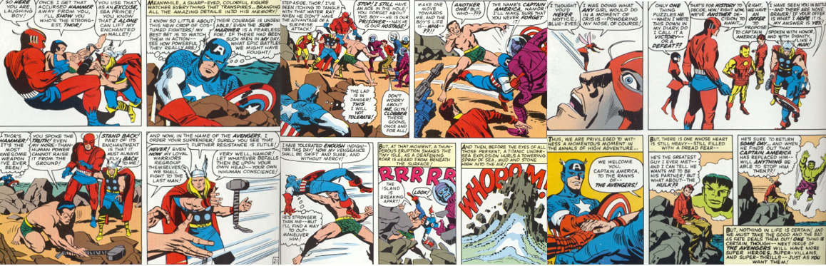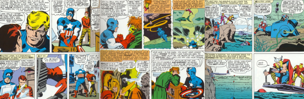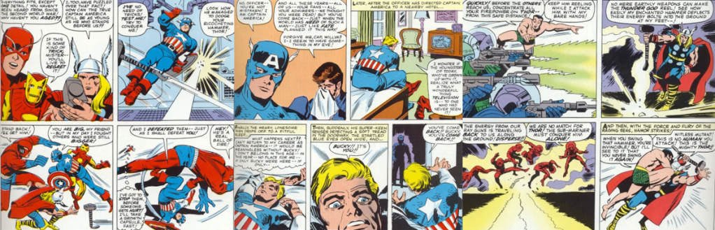 Namor witnesses these events from his deserted imperial castle using his “undersea scanner” and vows to avenge himself upon his enemies, a promise that suddenly becomes more viable when he conveniently stumbles upon a loyal troop of his elite guard. True to his word, Cap leads the Avengers in finding and freeing Vuk’s ship from the ocean depths, an act that earns them Vuk’s eternal gratitude and Cap’s admiration for the group’s unparalleled teamwork. Their victory is short-lived, however, as Namor and his elite guard suddenly attack the group; Iron Man goes toe-to-toe with Namor but his armour struggles to withstand the sledgehammer-like blows of the Sub-Mariner. In desperation, Iron Man blasts Namor with a “full [intensity] magnetic ray”, but this only grants him a temporary reprieve; with his armoured foe’s “greatest weapon” exhausted, Namor redoubles his attack, smashing a rock over Iron Man’s head and manhandling him to the ground. Momentarily powerless as he waits for his transistors to recharge, Iron Man is saved from certain death by the timely intervention of the Wasp, who Namor easily shrugs off before answering his lieutenant’s plea for help in subduing the rampaging Thor. Thanks to his mighty hammer, Thor easily holds back Namor’s forces by himself and repels the energy bolts fired at him by their ray guns, forcing Namor to leap at the Thunder God to tackle him directly. After slipping free of the Atlantean’s net and saving himself from drowning, Giant-Man returns to the fray to assist Iron Man, hurling the Atlanteans off-panel with his massive strength before rushing to aid Thor in tussling with Namor, who’s become obsessed with wrestling Mjölnir from Thor’s grasp. Watching from the side lines, Cap can’t help but be impressed by the power and courage of the Avengers and in awe of Mjölnir, a weapon so powerful that only the Mighty Thor can lift it. Although the Avengers clearly have Namor beat, the proud prince refuses to surrender and lowers himself to threatening Rick’s life. This irks Cap so much that he finally leaps into action, tackling Namor’s elite guard and briefly being overpowered by the Sub-Mariner before the tiny isle on which they’re all fighting suddenly (and conveniently) breaks apart from an undersea explosion caused by Vuk’s ship. Confident that his enemies will drown beneath the resulting waves, Namor commands his forces to retreat, unaware that the heroes easily survived by clinging to the remains of the island. Impressed by Cap’s prowess in battle, the Avengers ask him to join their little team and he gratefully accepts, but Rick is left pondering the fate of his friend and partner, the Hulk, whose rage at being “replaced” by Captain America is as sure as the inevitability that the Avengers will butt heads with the Sub-Mariner again before long.