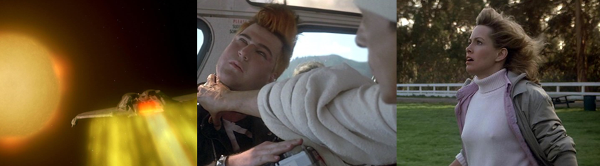 One aspect of The Voyage Home that has always irked me is how cheap the production is; almost everything is recycled from the last two films, including the crew’s wardrobe, the sets, and the models. I can’t totally begrudge this as it makes sense, in continuity, to carry these elements over but you’d think that Kirk and the others would’ve had some Vulcan clothing after spending three months there! This is most obviously felt in the fact that the film largely takes place in 1986 thanks to some janky time travel physics, meaning a lack of space action and battles. This is a bit of a shame as the model work and practical effects remain as charming as ever and the depiction of time warp, through the use of surreal imagery and conflicting sound bites, is very interesting. I also liked seeing the crew on the dingy Bounty and forced to adapt to its less refined Klingon specifications, and that the ship was almost shaken to pieces by travelling at such impossible speeds, but it spends most of the film parked and cloaked in Golden Gate Park since the focus is more on the comedic shenanigans of placing the crew in the primitive then-modern day. There’s a fair bit of comedy to be had in this setting, though; the crew are like fish out of water and are confused that whales are in the city (since I guess zoos aren’t a thing in the future), puzzled by the clothing and “colourful metaphors” of the less civilised inhabitants, and with little idea of the concept or value of money and the primitive technology of the time. This leads to some of my favourite scenes of the film, such as Kirk and Spock encountering a particularly abrasive bus passenger (Kirk Thatcher), Scotty trying to communicate to the PC through the mouse, Chekov’s madcap infiltration of a military submarine and subsequent interrogation, and Bones’ grumbling disregard for the primitive medicine of these “Dark Ages”. Still, it is a bit disappointing that so much of the film is set in 1986; it makes for some fun moments, but it hardly screams big-budget sci-fi adventure, and the focus is more on comedy and awkward interactions between the crew and the inhabitants of the time.